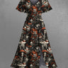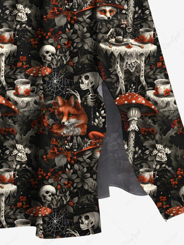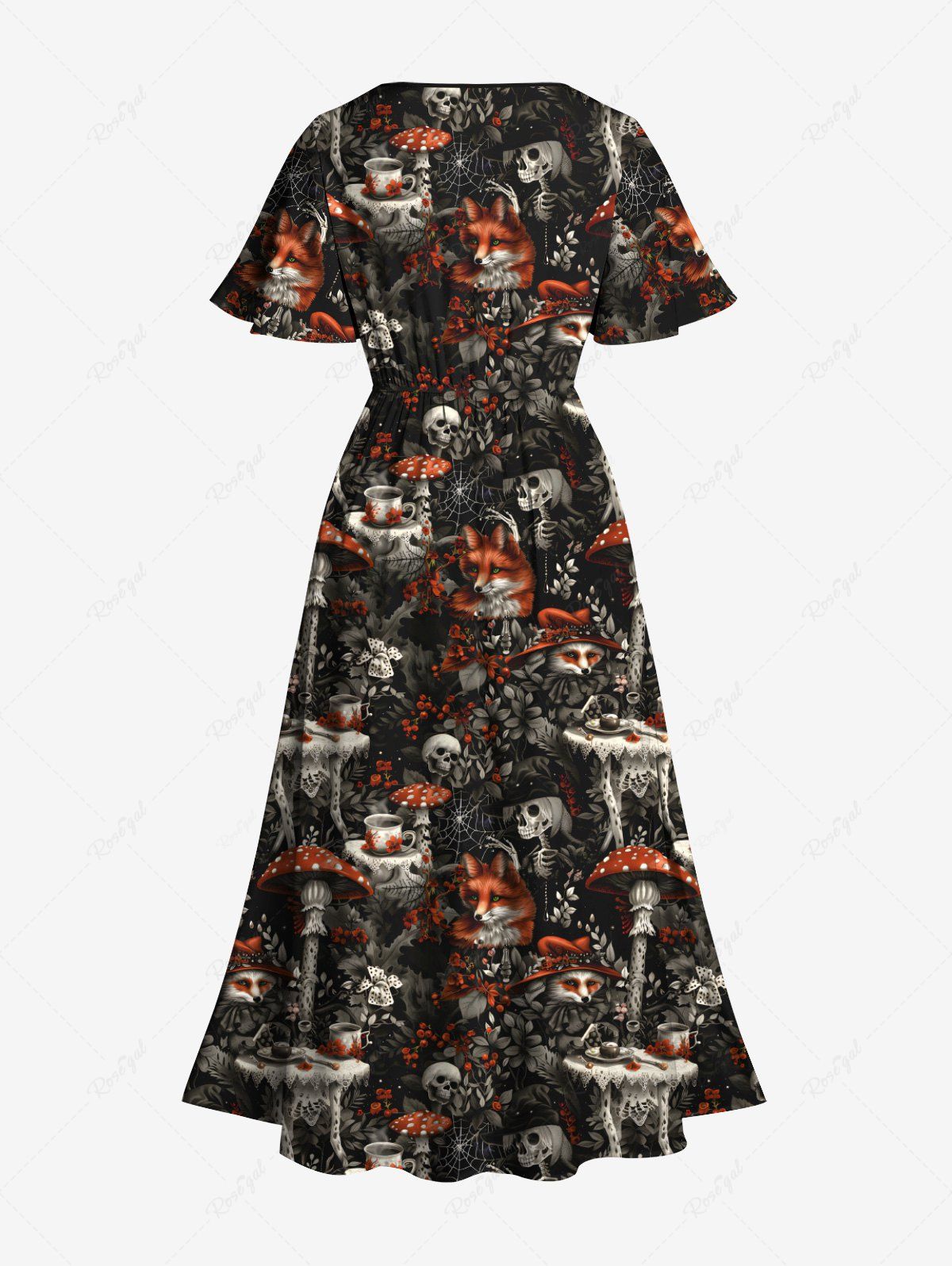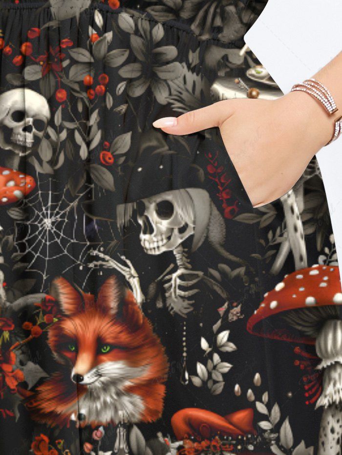 Gothic Plus Size Skull Skeleton Fox Flower Mushroom Print Split Pocket A Line Midi Dress
