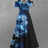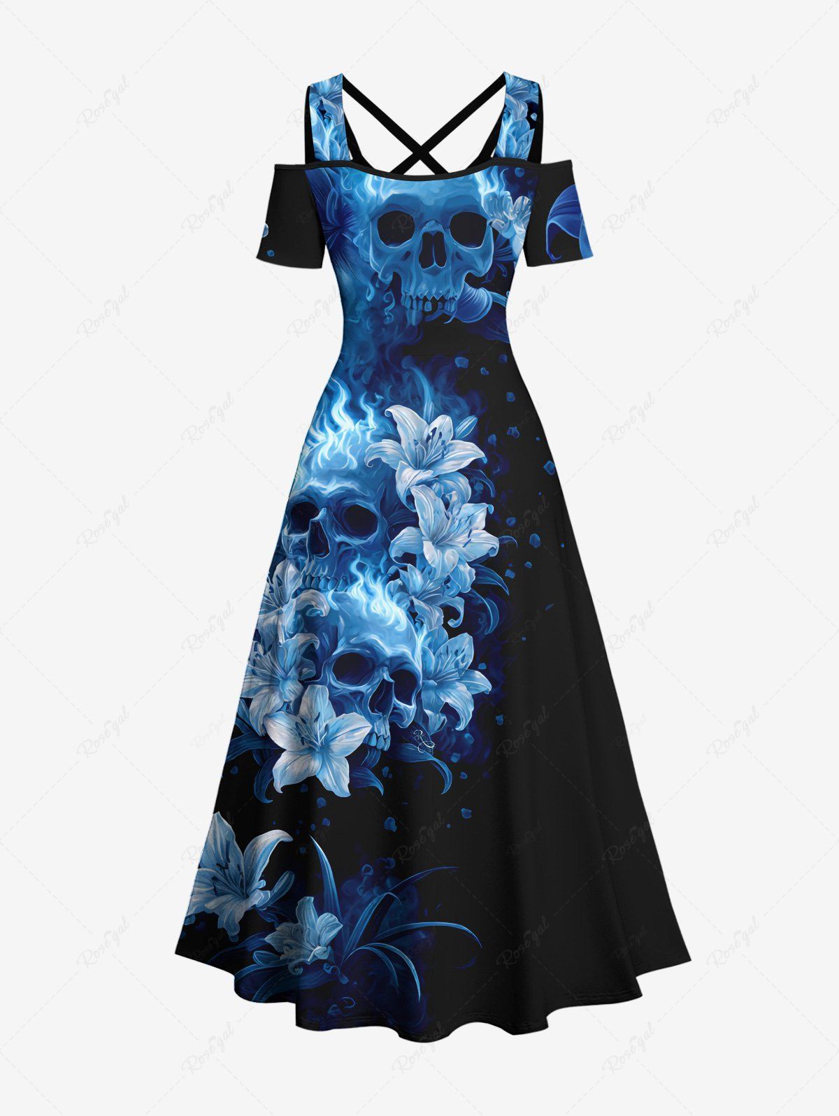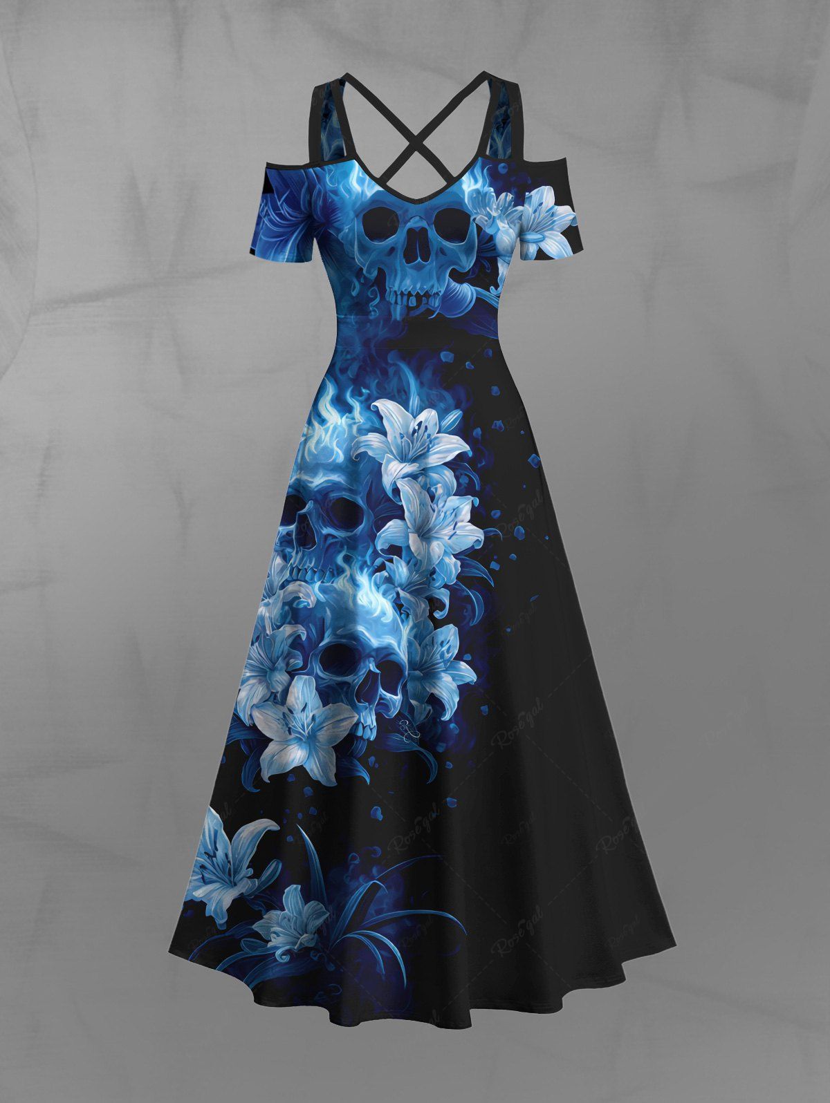 Gothic Plus Size Skulls Flowers Fire Flame Print Cold Shoulder Crisscross Maxi Dress