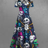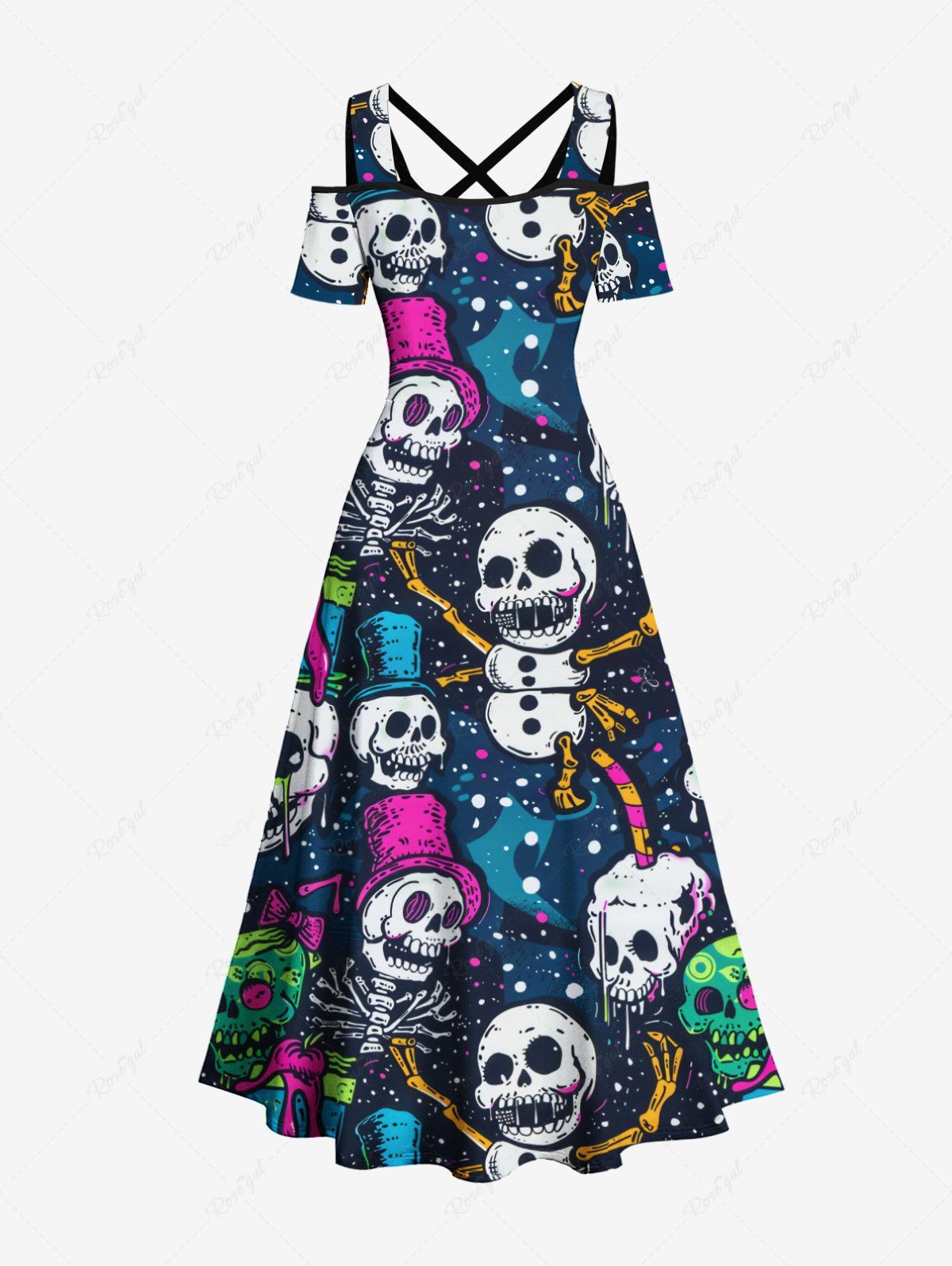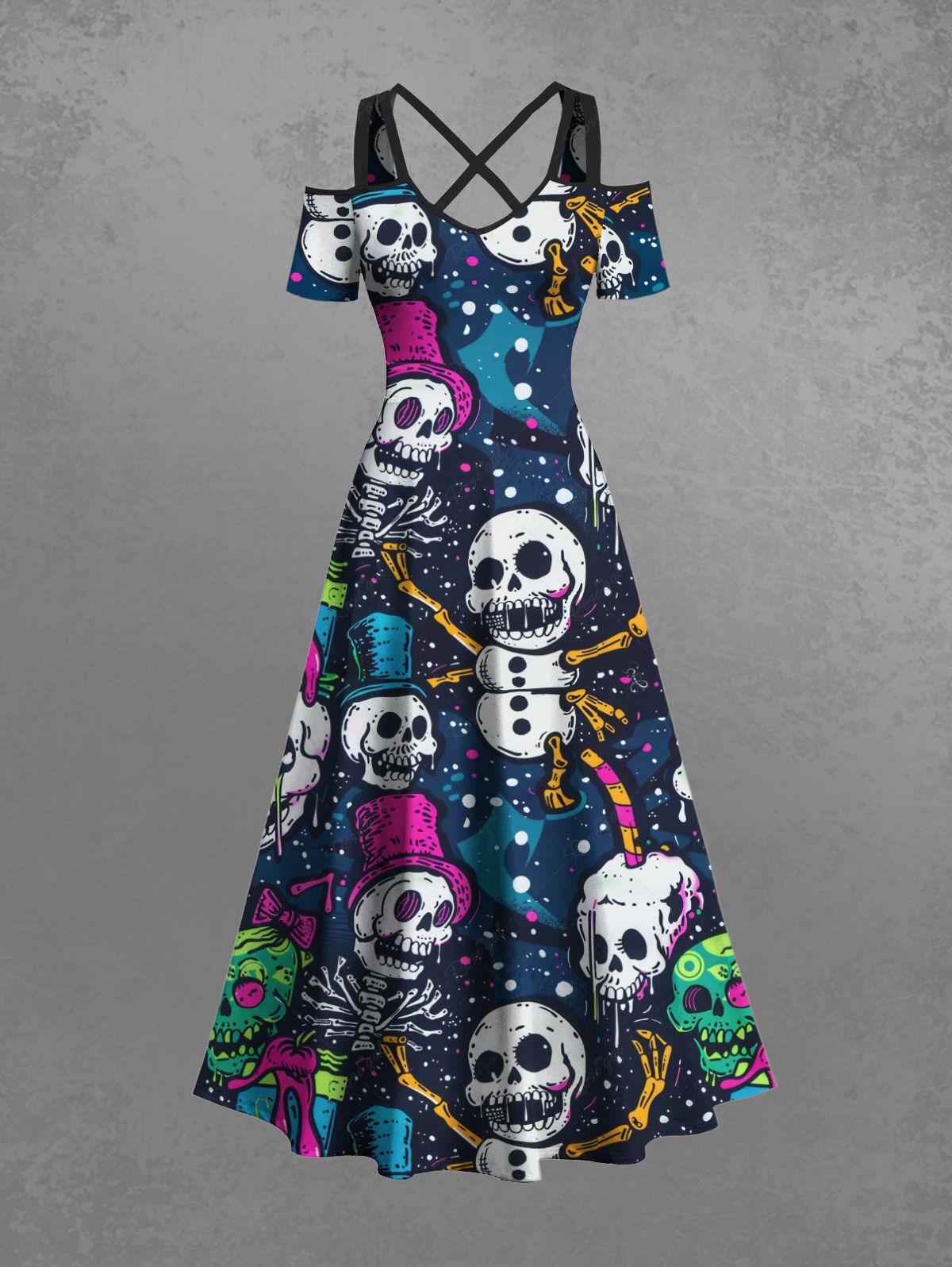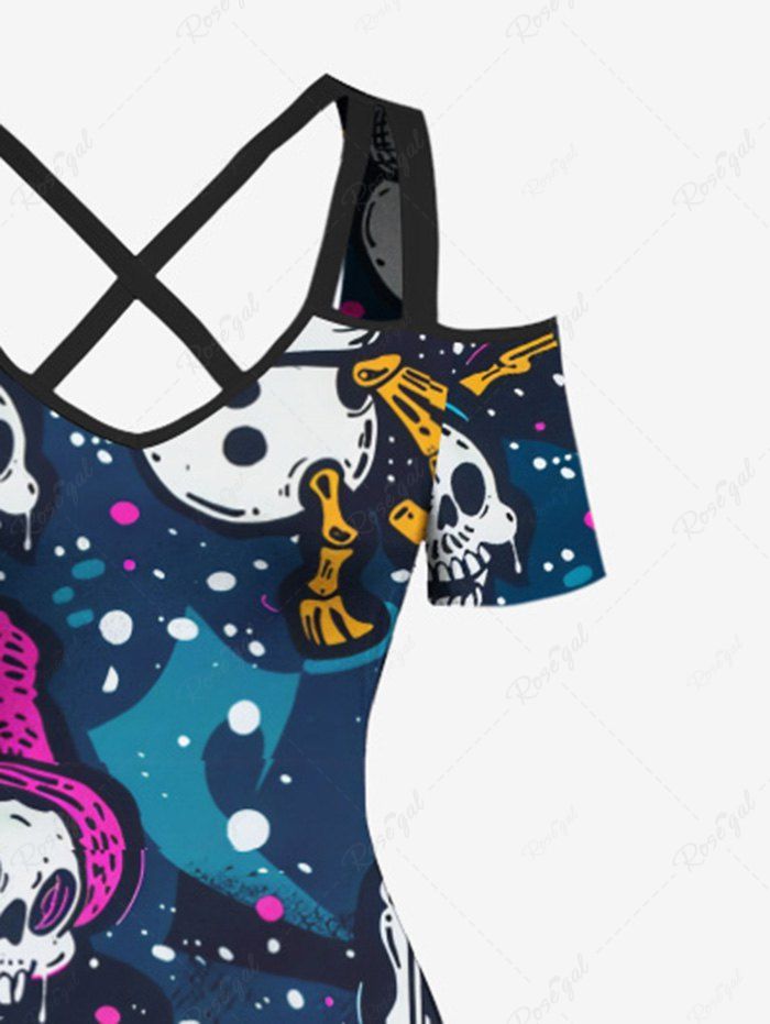 Gothic Plus Size Skulls Hat Bowknot Paint Splatter Print Cold Shoulder Crisscross Maxi Dress