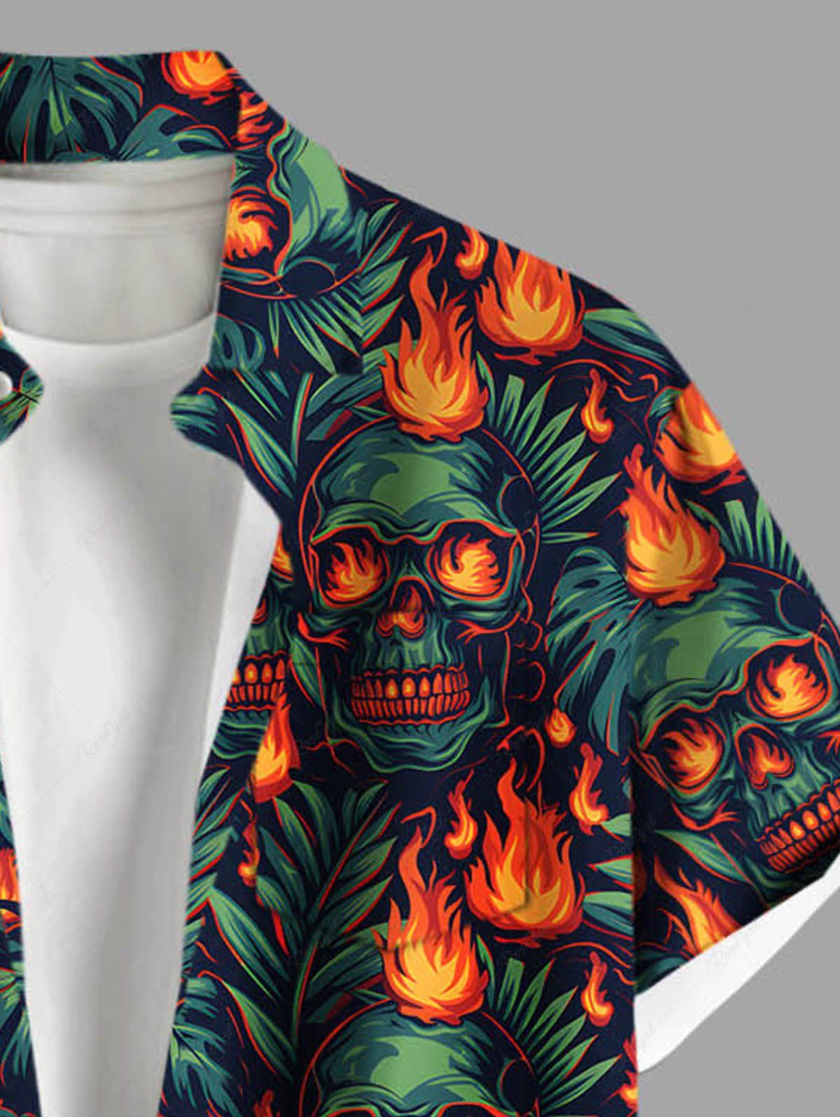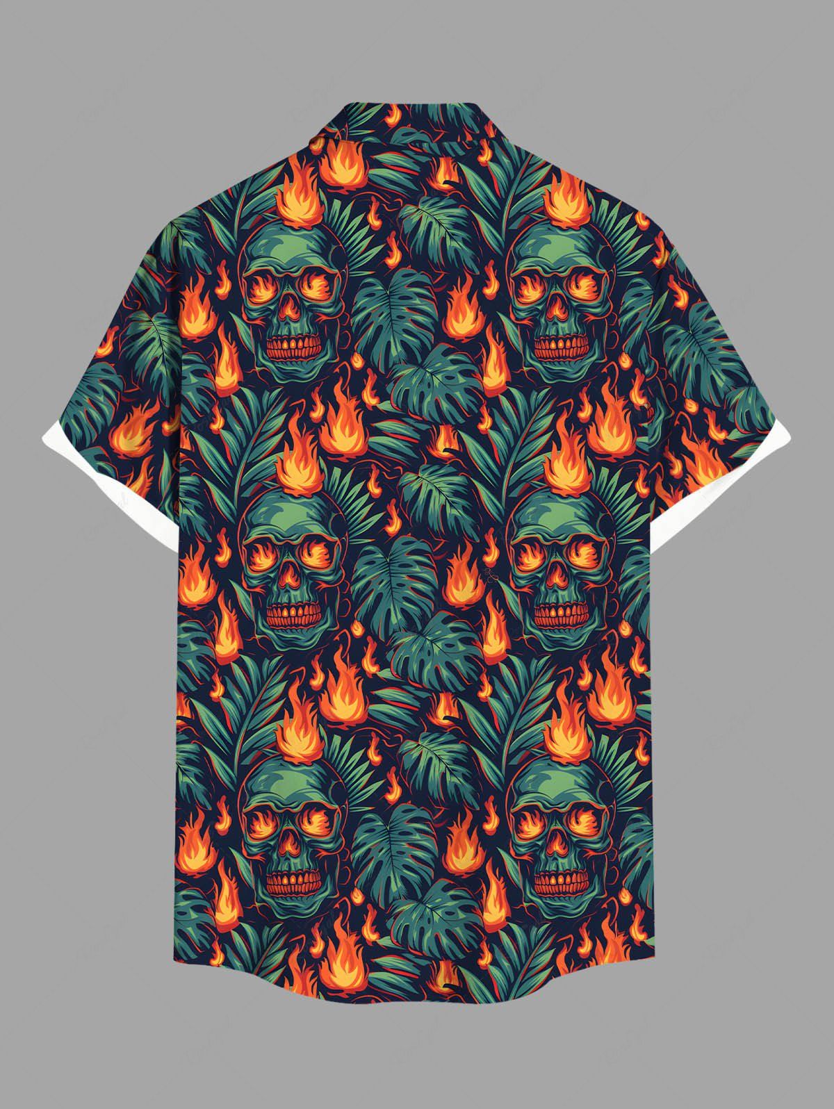 Gothic Plus Size Skulls Fire Flame Tropical Leaf Print Buttons Pocket Halloween Shirt For Men