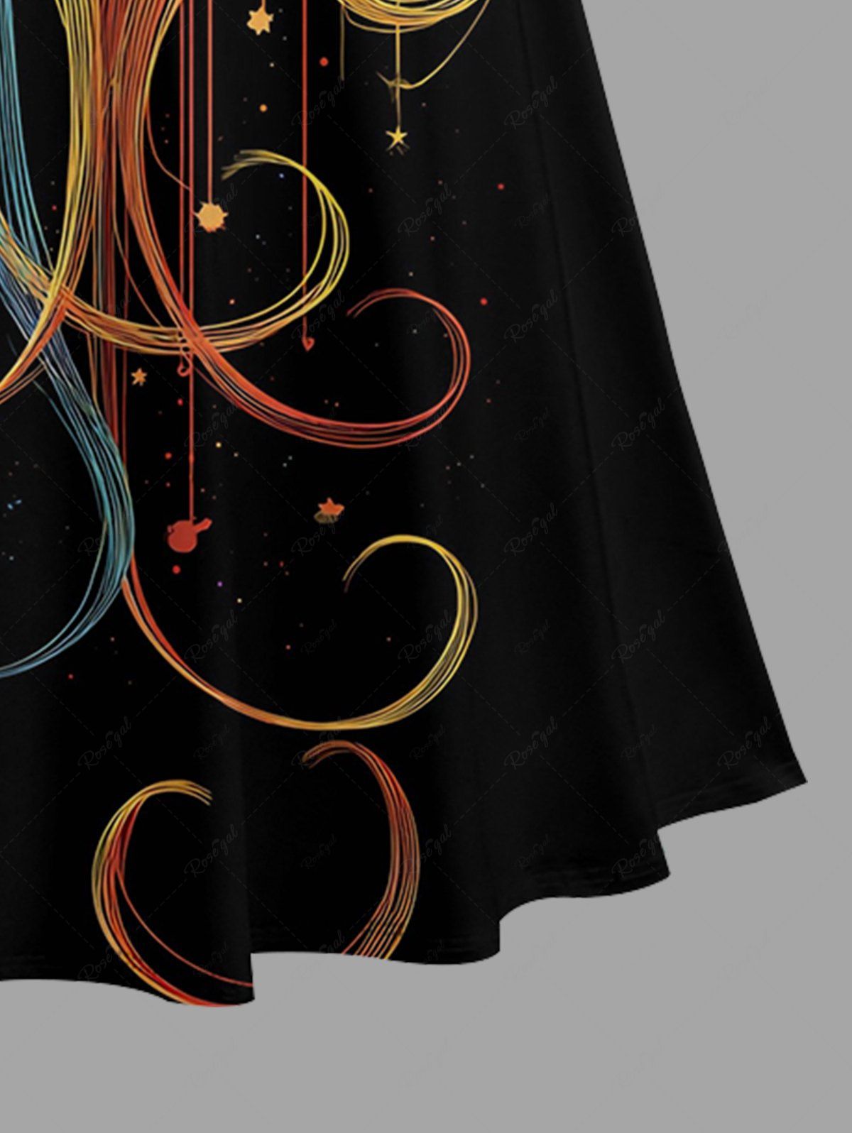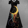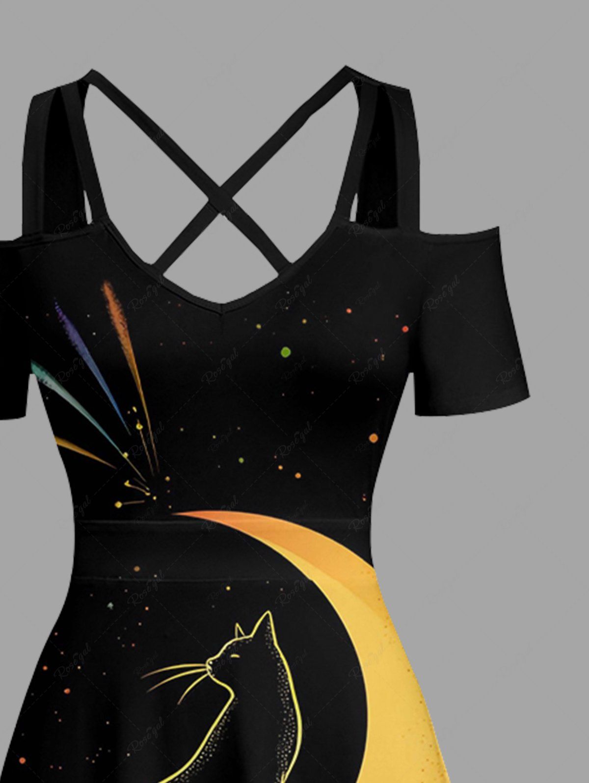 Gothic Plus Size Moon Cat Print Cold Shoulder Crisscross Strappy A Line Maxi Dress