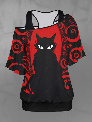 Gothic Plus Size Basic Solid Racerback Tank Top and Cat Eye Spiral Print Skew Neck Batwing Sleeves T-shirt Set