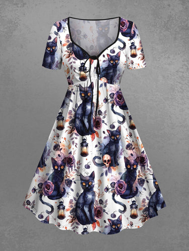 Gothic Cat Skulls Rose Flower Leaf Print Halloween Costume Cinched A Line Dress