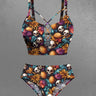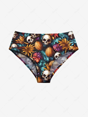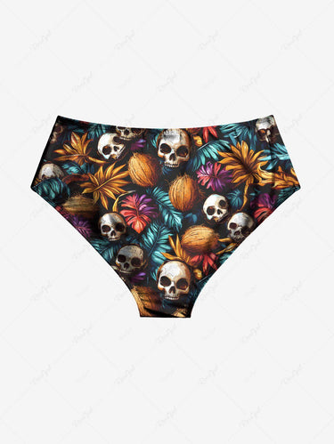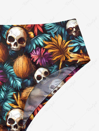 Gothic Colorful Skull Coconut Tropical Leaves Print Hawaii Lace Up Tankini Swimsuit