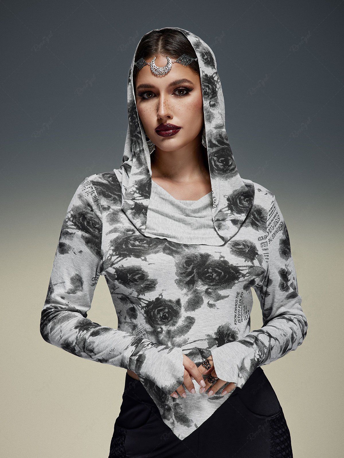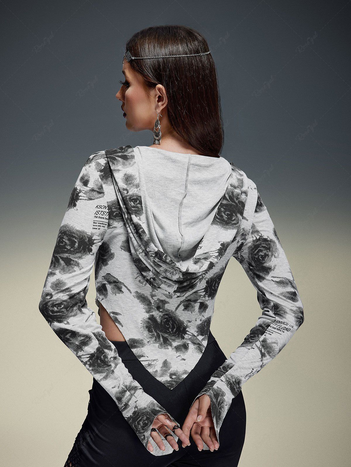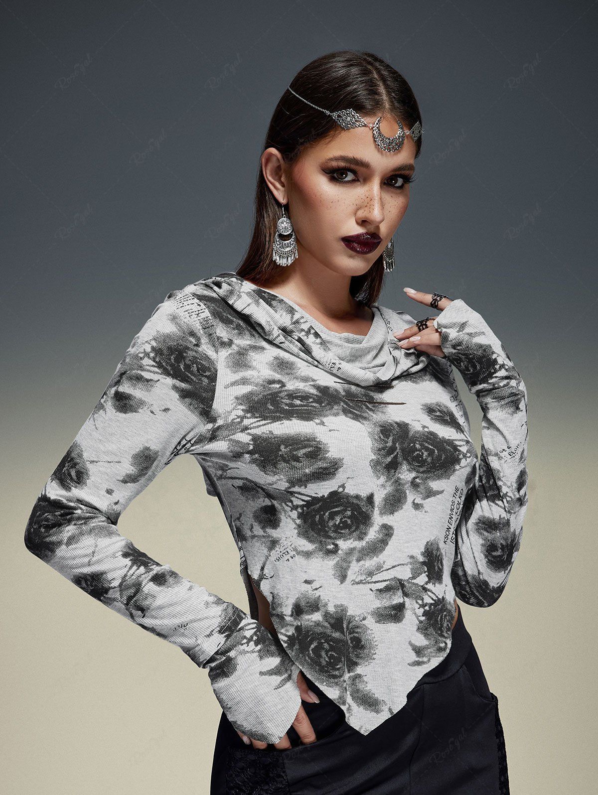 Gothic Plus Size Distressed Floral Print Asymmetric Hooded Long Sleeves T-shirt