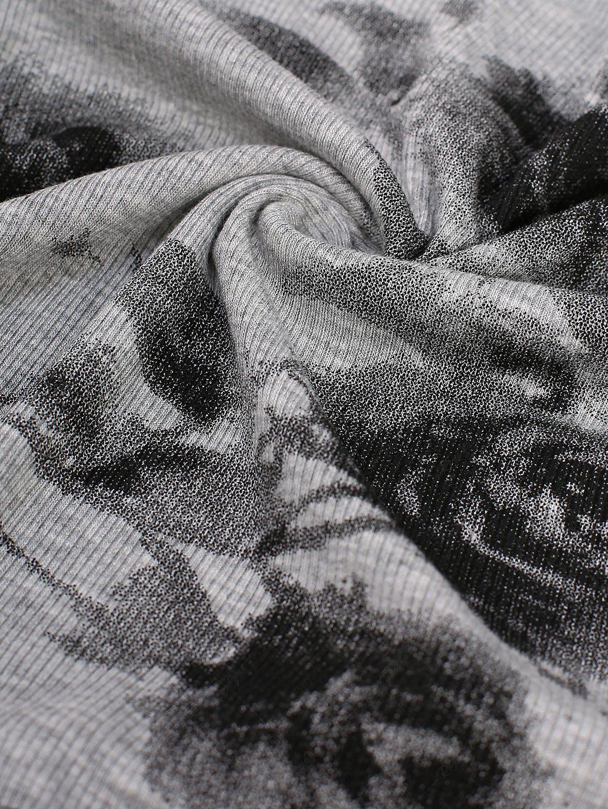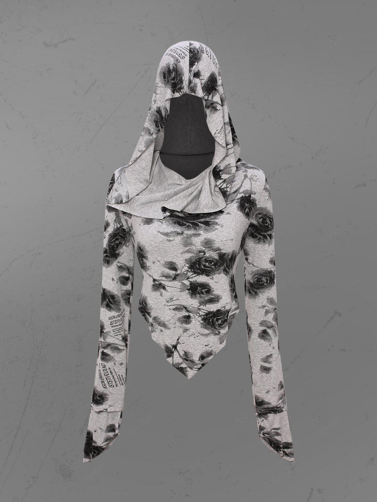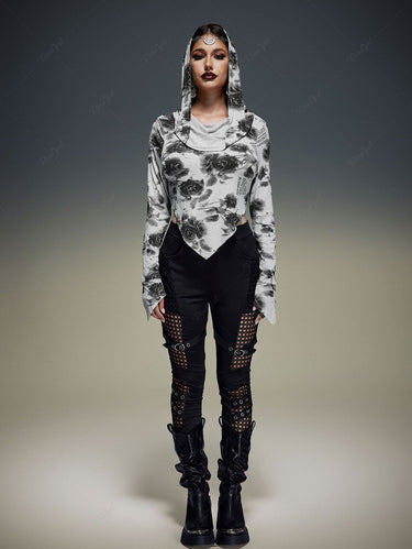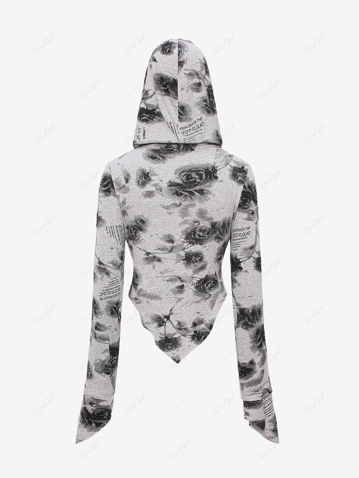 Gothic Plus Size Distressed Floral Print Asymmetric Hooded Long Sleeves T-shirt