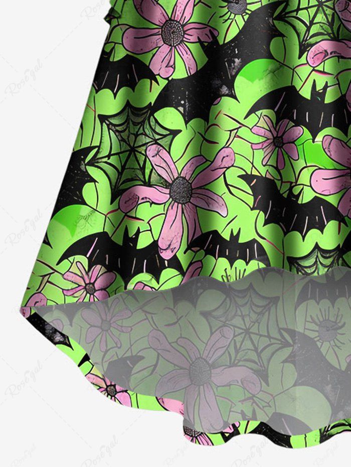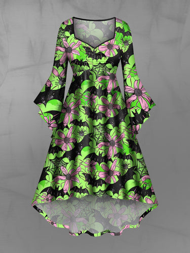 Gothic Plus Size Flare Sleeves Bat Spider Web Floral Leaves Printed Ruched High Low Halloween Costume Asymmetric A Line Dress