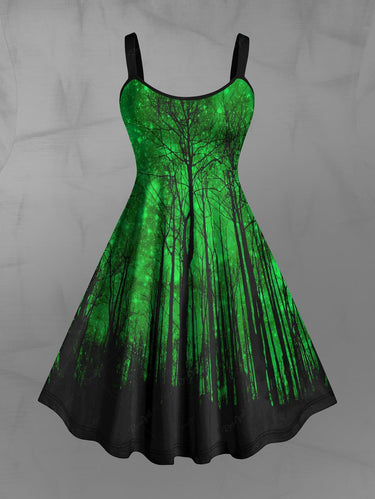 Gothic Plus Size Forest Tree Glitter Galaxy Print Backless A Line Tank Dress