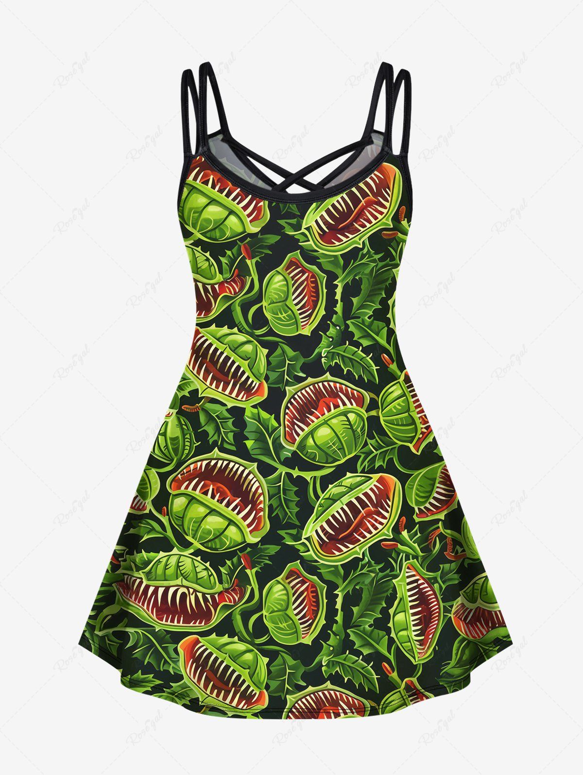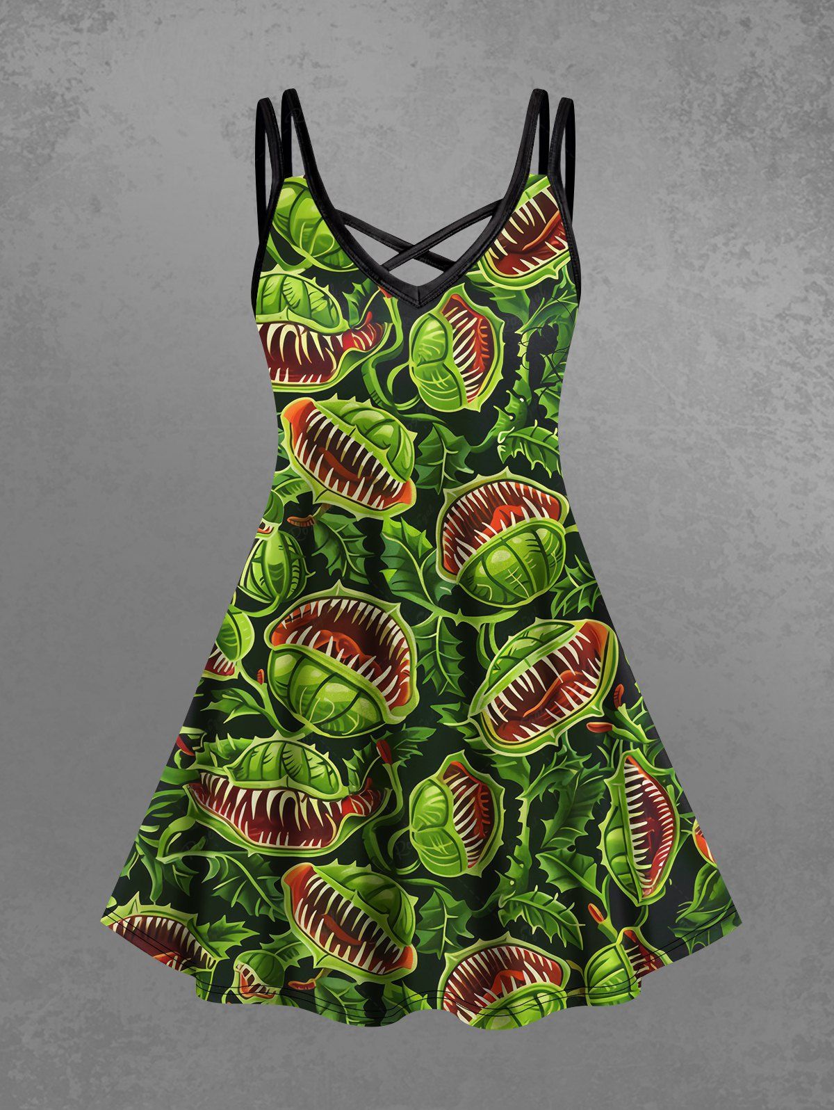 Gothic Plus Size Piranha Plant Print Crisscross A Line Cami Dress