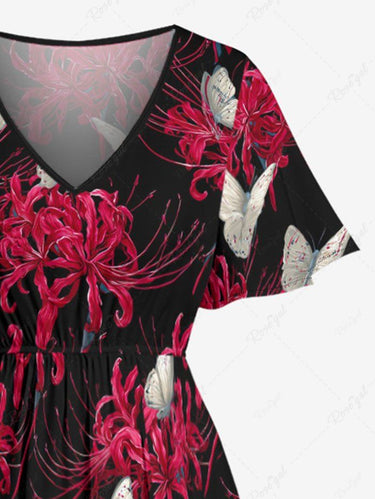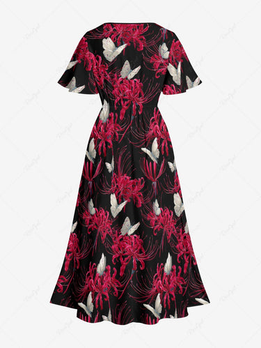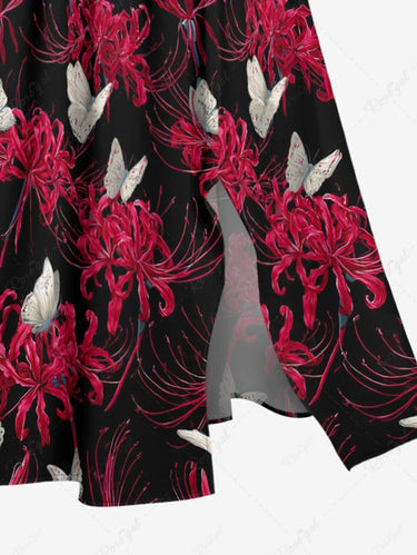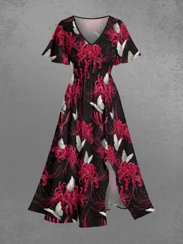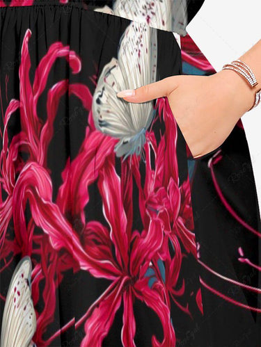 Gothic Plus Size Butterfly Flower Print Split Pocket A Line Midi Dress