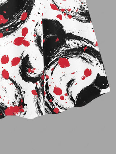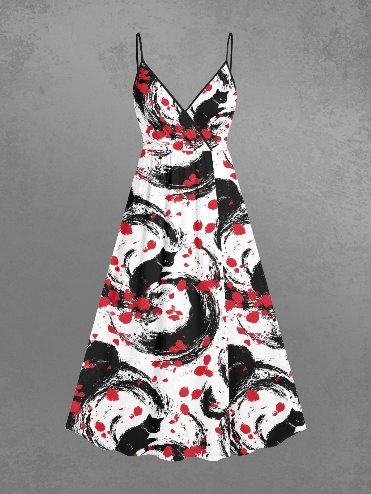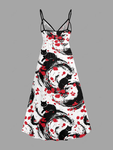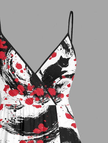 Gothic Plus Size Cat Petal Ink Painting Print Surplice A Line Cami Dress