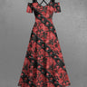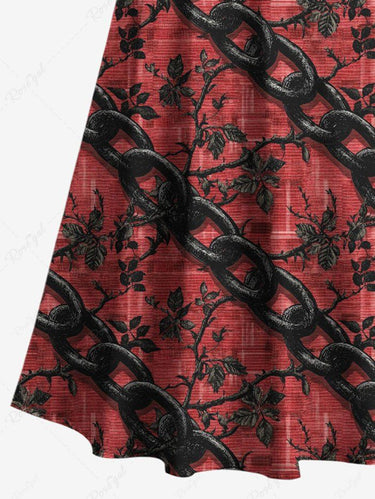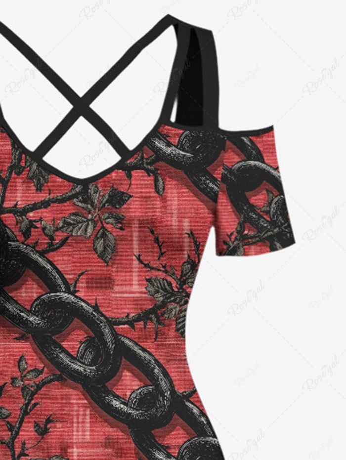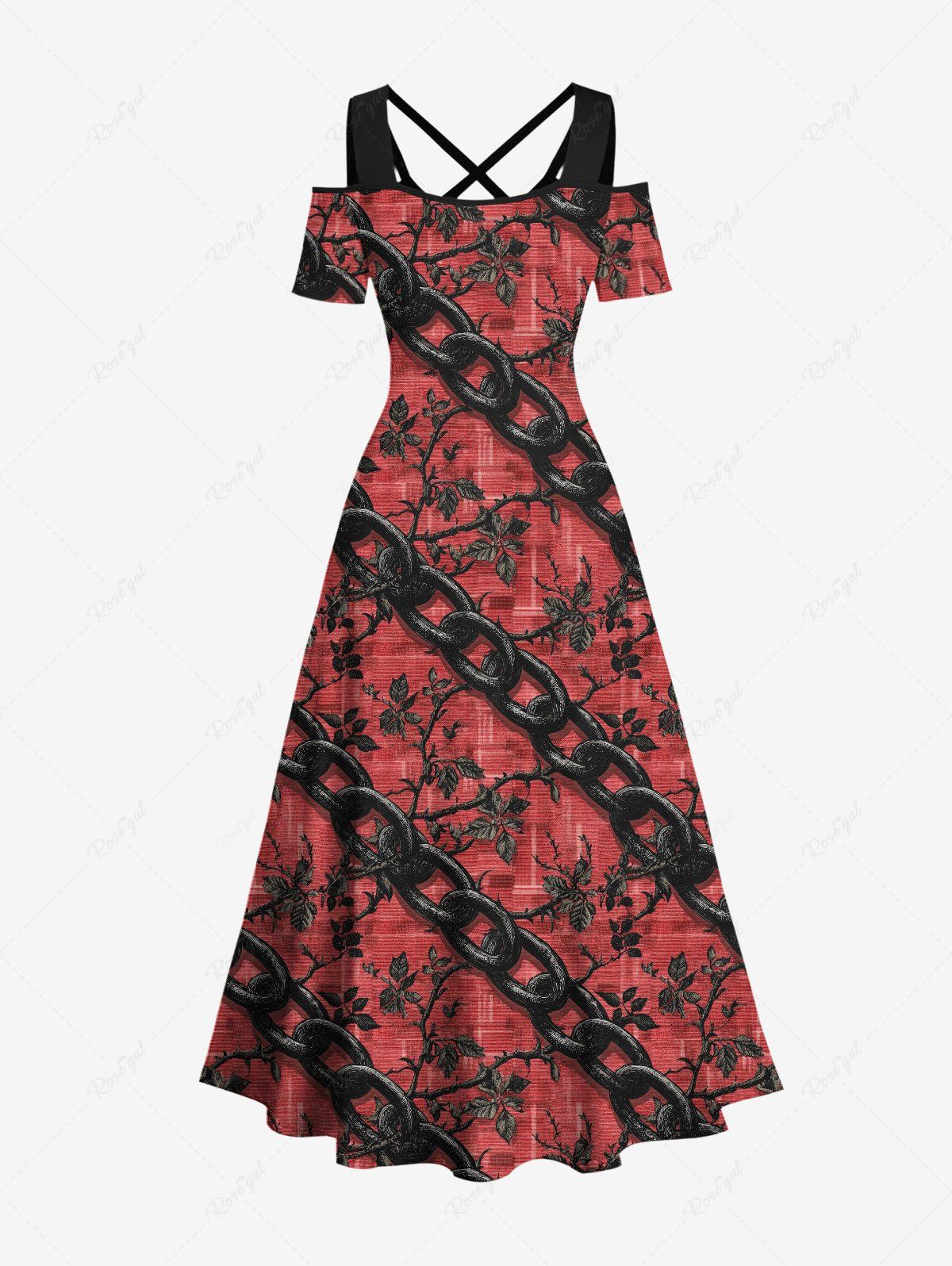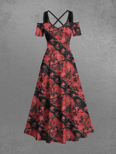 Gothic Plus Size Chain Leaf Branch Print Cold Shoulder Crisscross Strappy A Line Maxi Dress