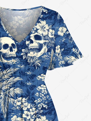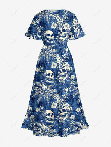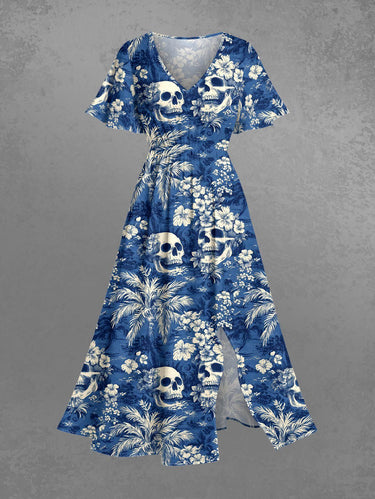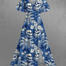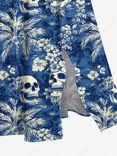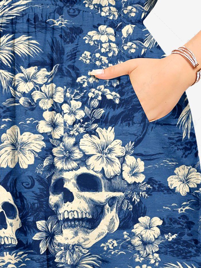 Gothic Plus Size Coconut Tree Skull Hibiscus Flower Print Hawaii Split Pocket A Line Midi Dress