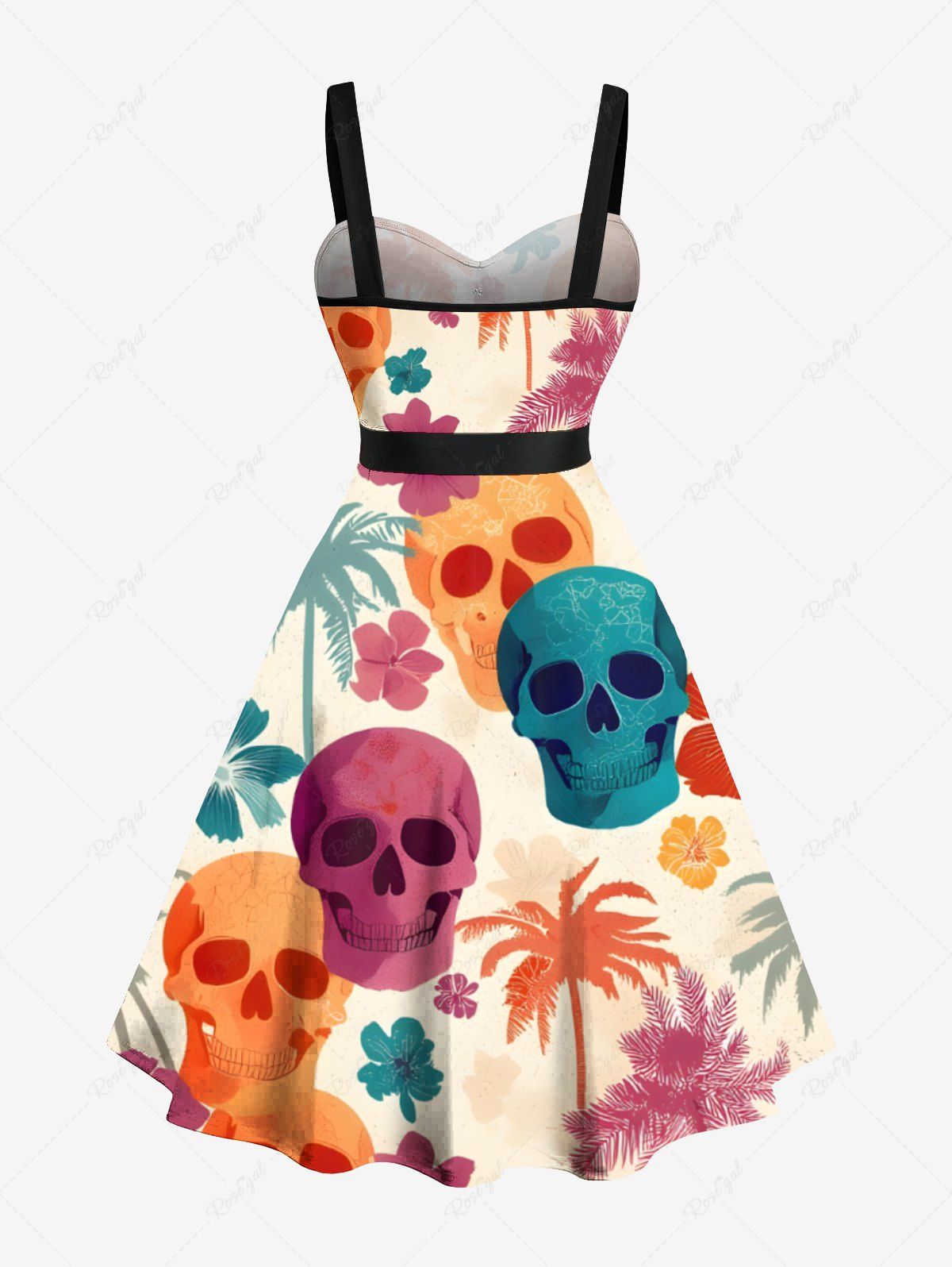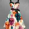 Gothic Plus Size Colorful Coconut Tree Skull Hibiscus Flower Print Hawaii Button A Line Dress with Removable Belt