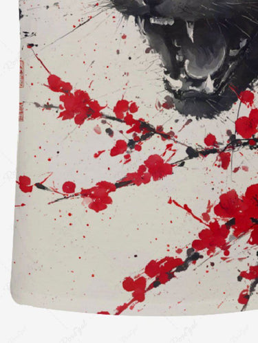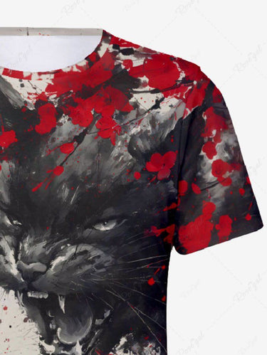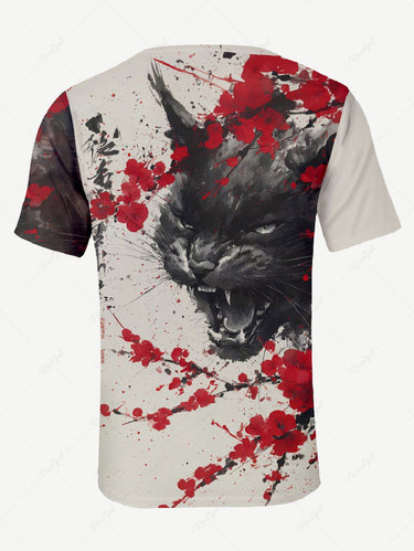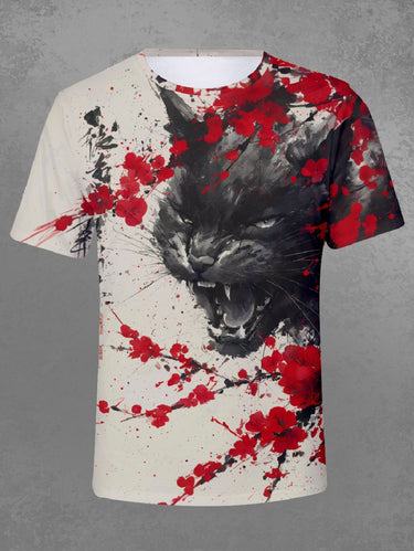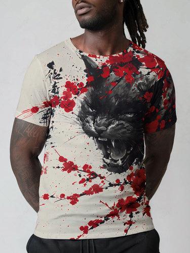 Gothic Plus Size Ink Painting Cat Flower Branch Print T-shirt For Men