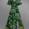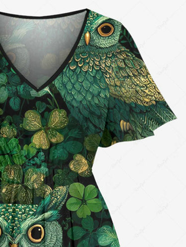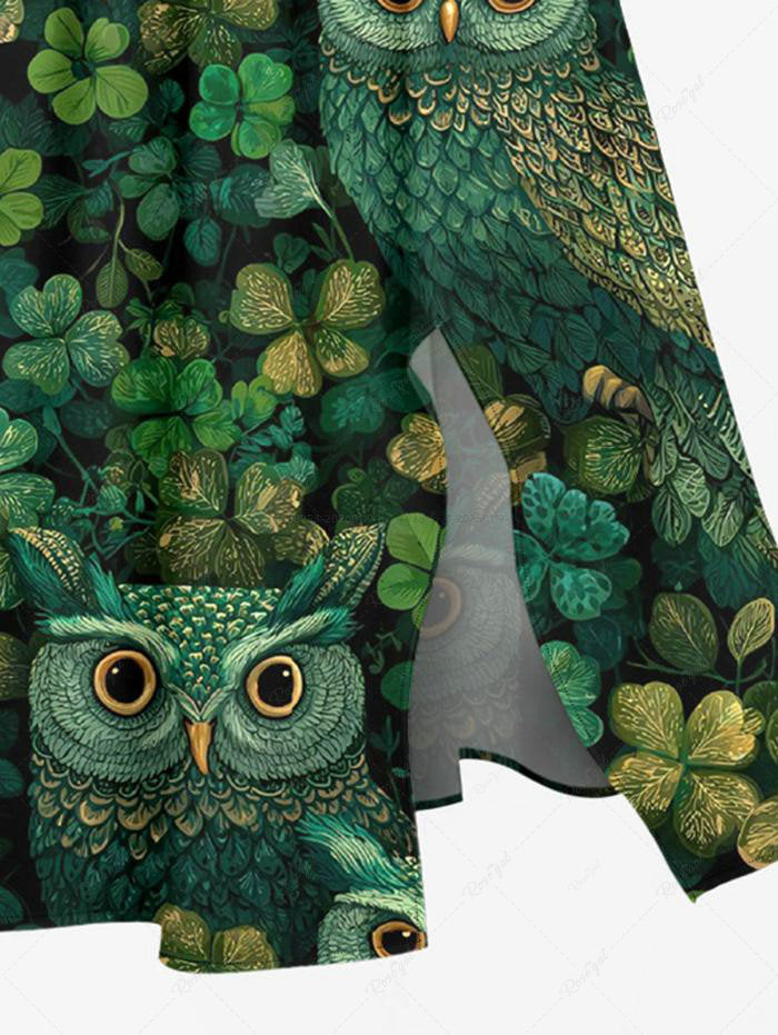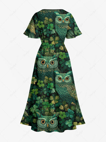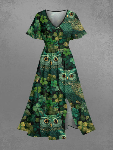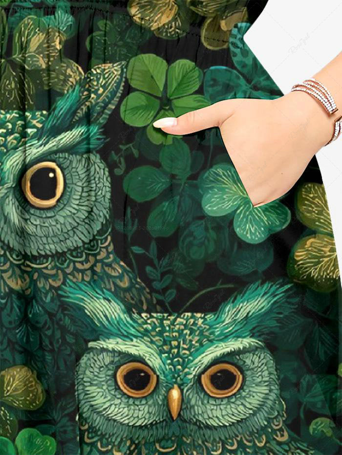 Gothic Plus Size Owl Leaf Print St. Patrick's Day Split Pocket A Line Midi Dress