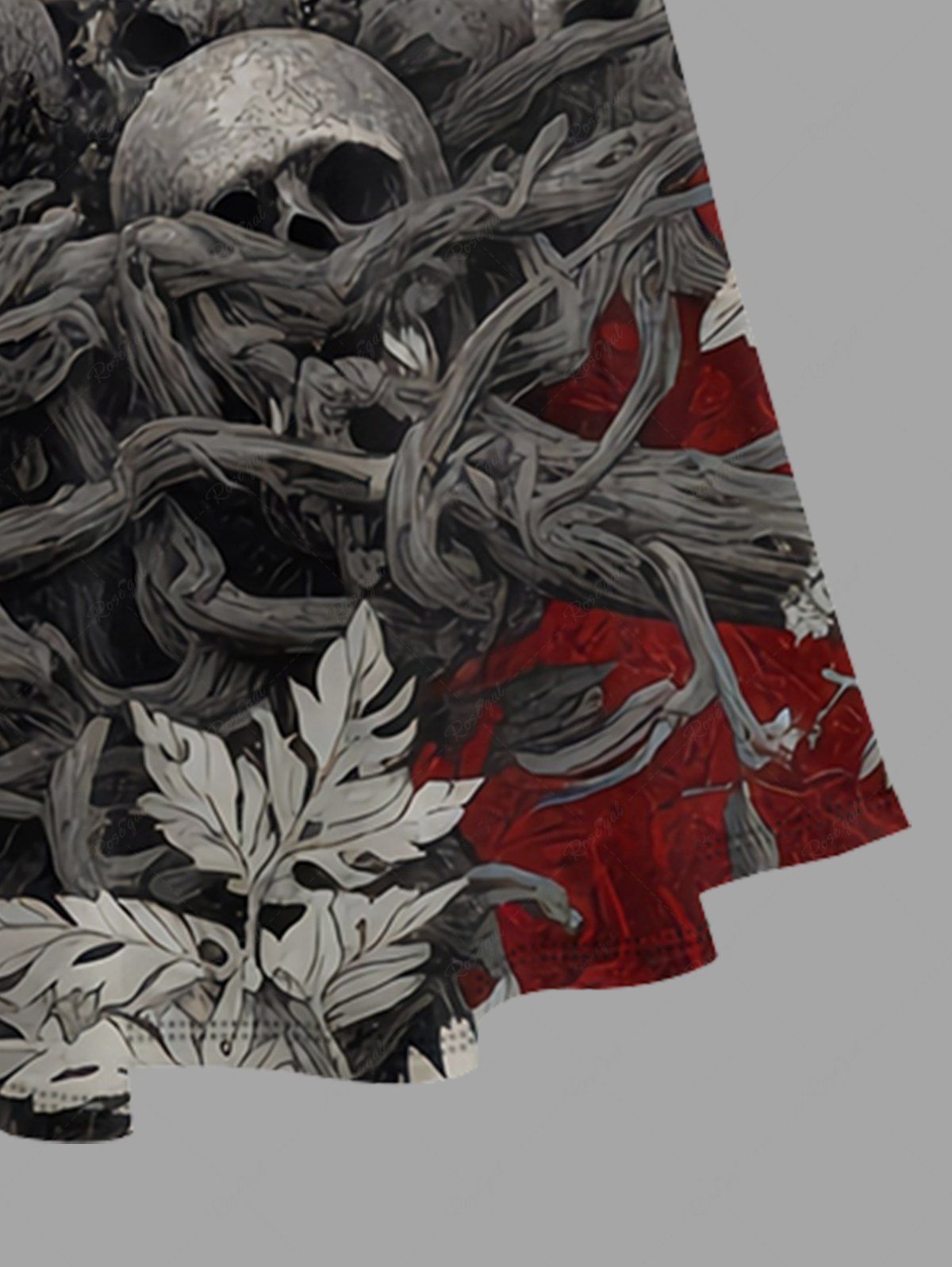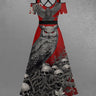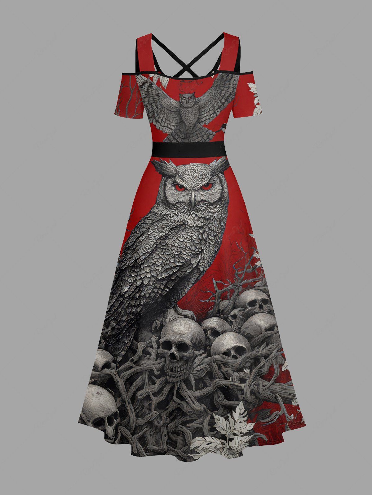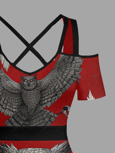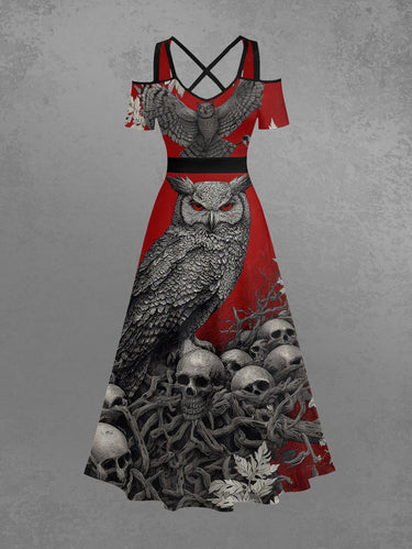 Gothic Plus Size Owl Skull Tree Branch Leaf Print Cold Shoulder Crisscross A Line Maxi Dress