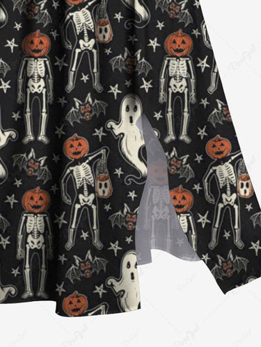 Gothic Plus Size Pumpkin Skeleton Ghost Bat Stars Print Halloween Costume Split Pocket A Line Midi Dress