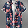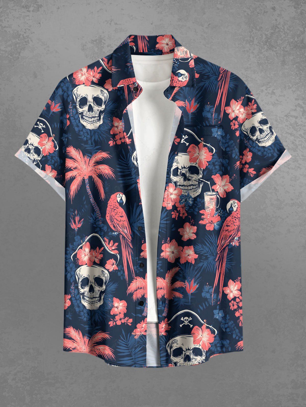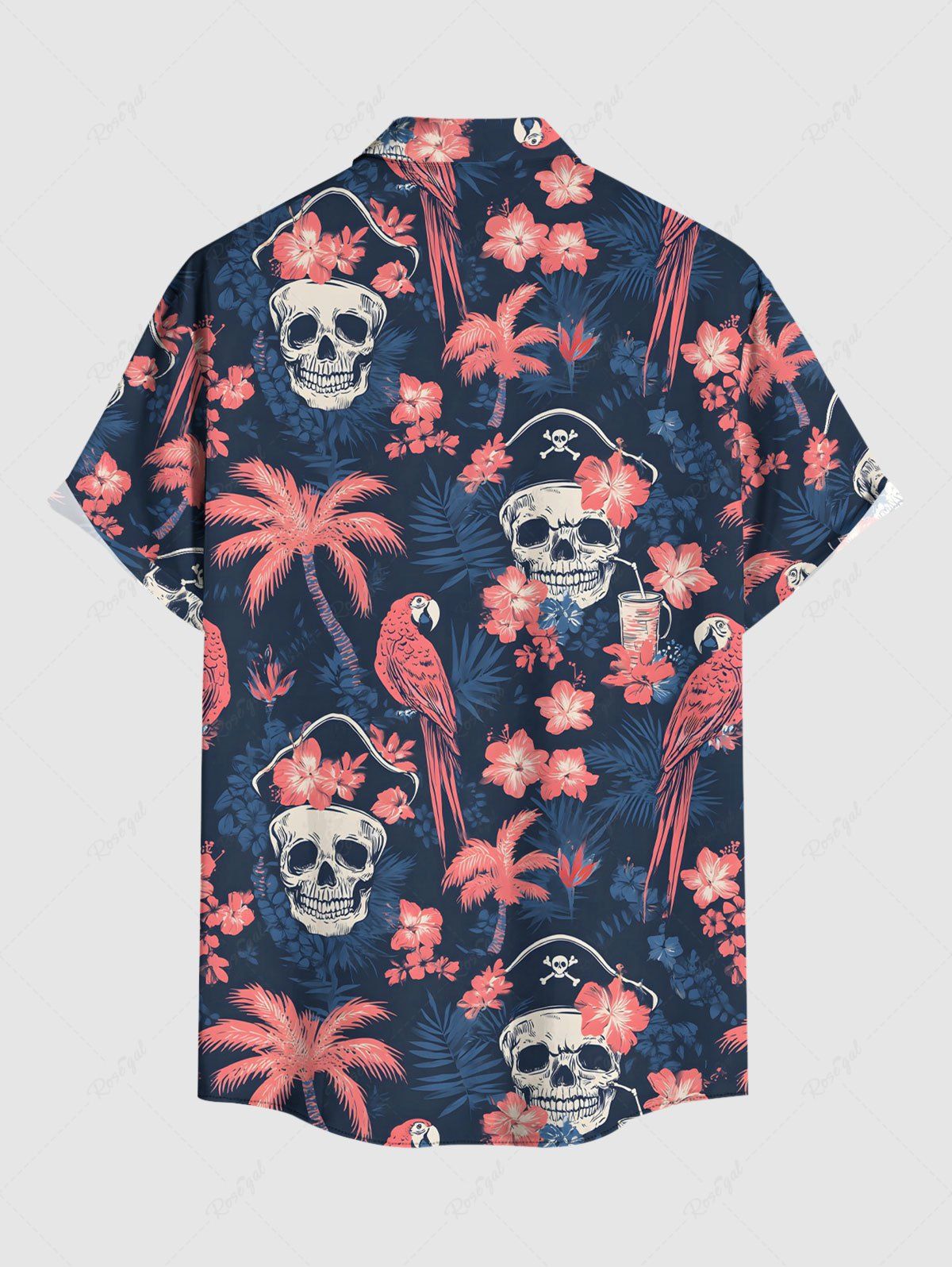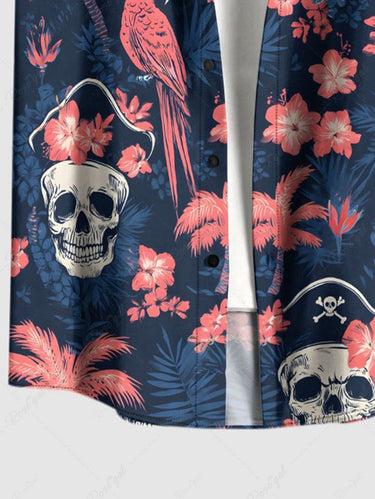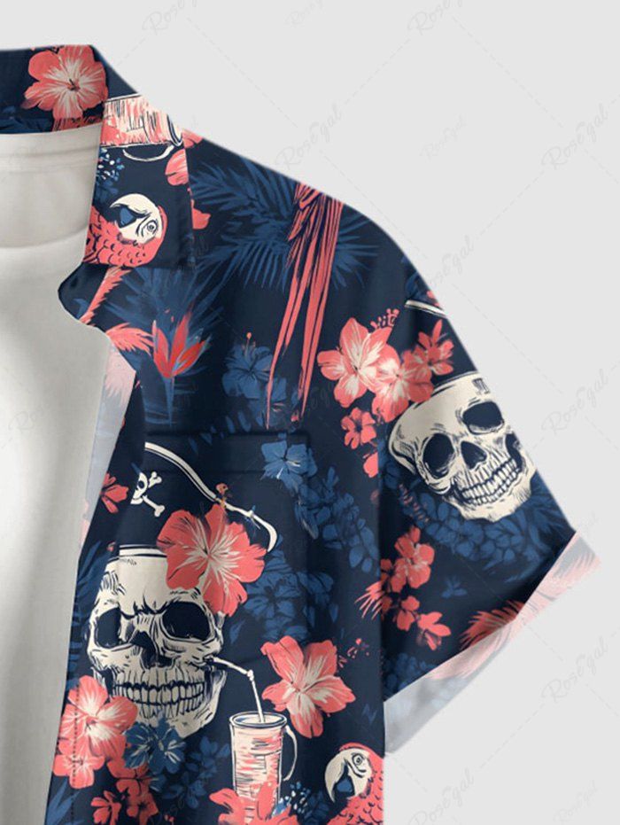 Gothic Plus Size Skull Coconut Tree Hibiscus Flower Parrot Print Hawaii Button Pocket Shirt For Men