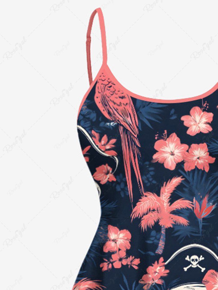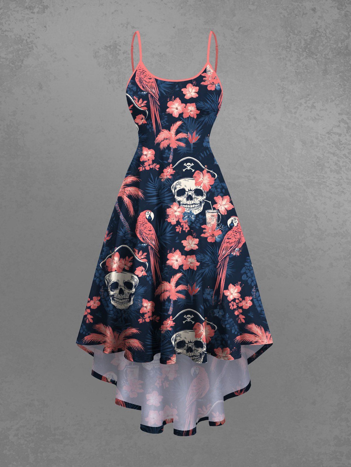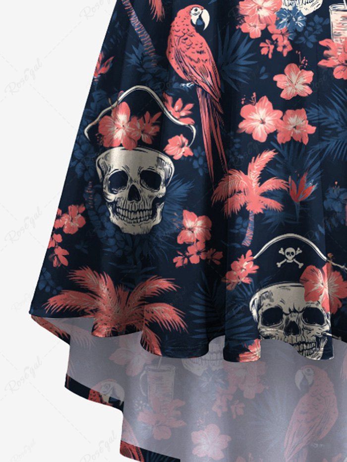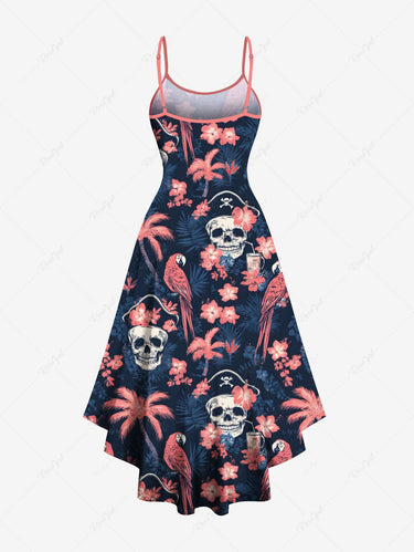 Gothic Plus Size Skull Coconut Tree Hibiscus Flower Parrot Print Hawaii High Low Asymmetric Cami Dress