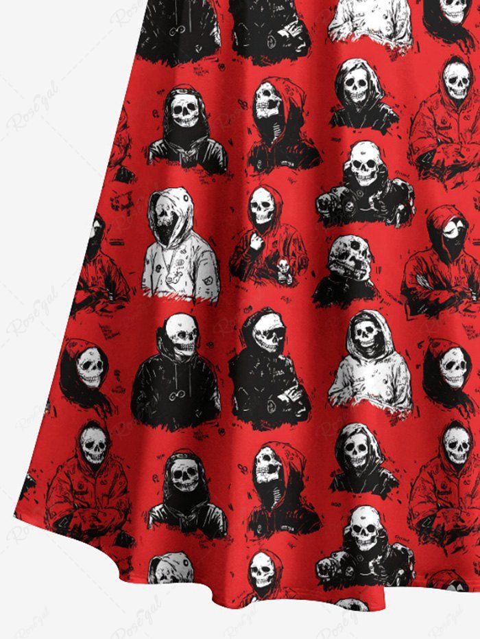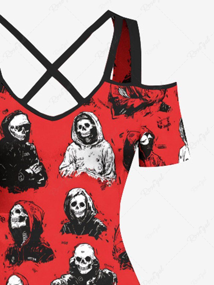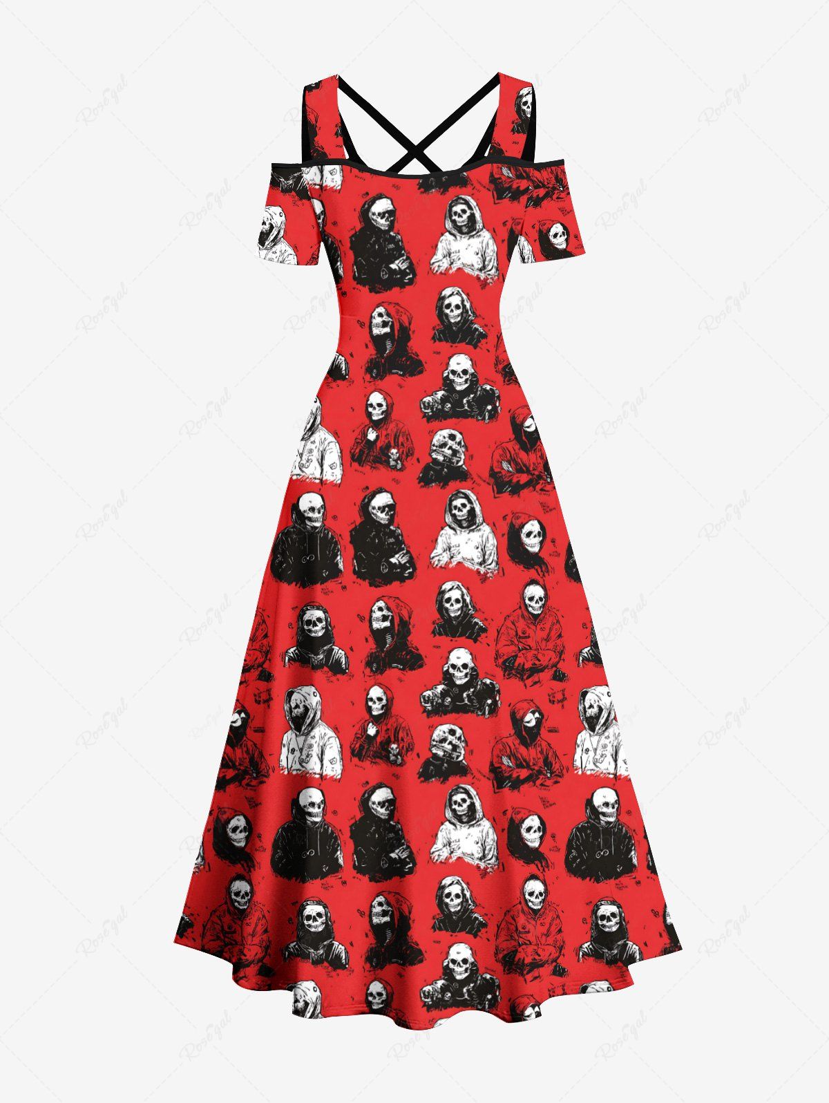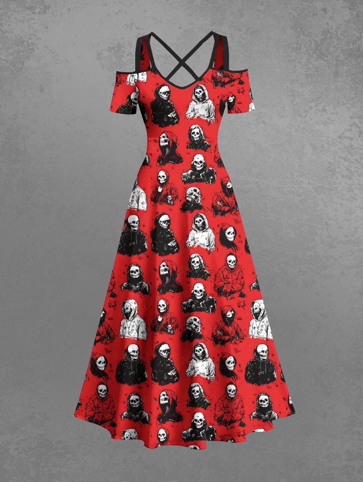 Gothic Plus Size Skull Man Print Cold Shoulder Crisscross Strappy A Line Maxi Dress
