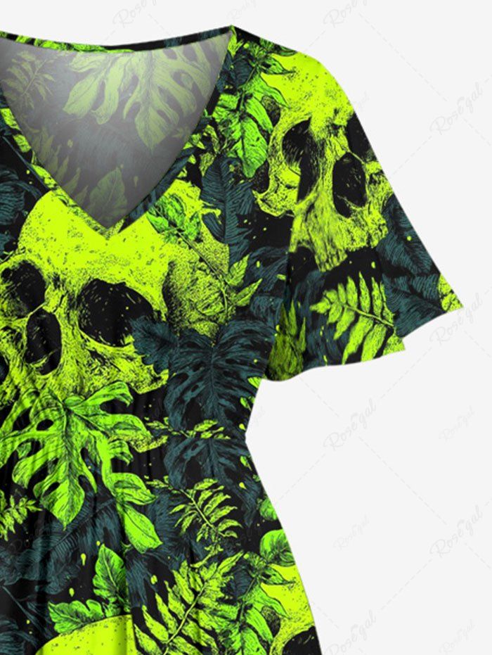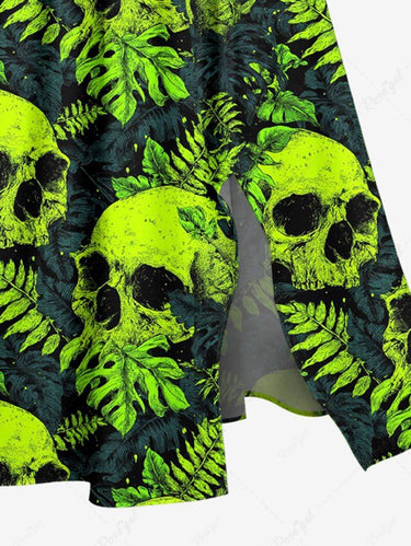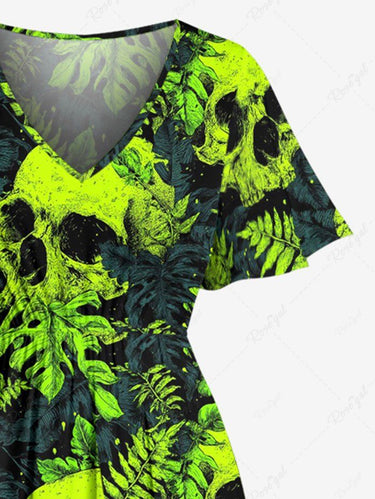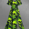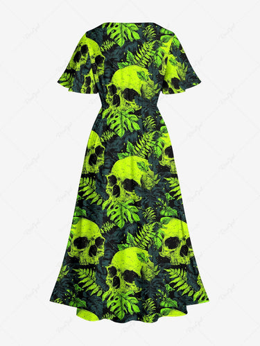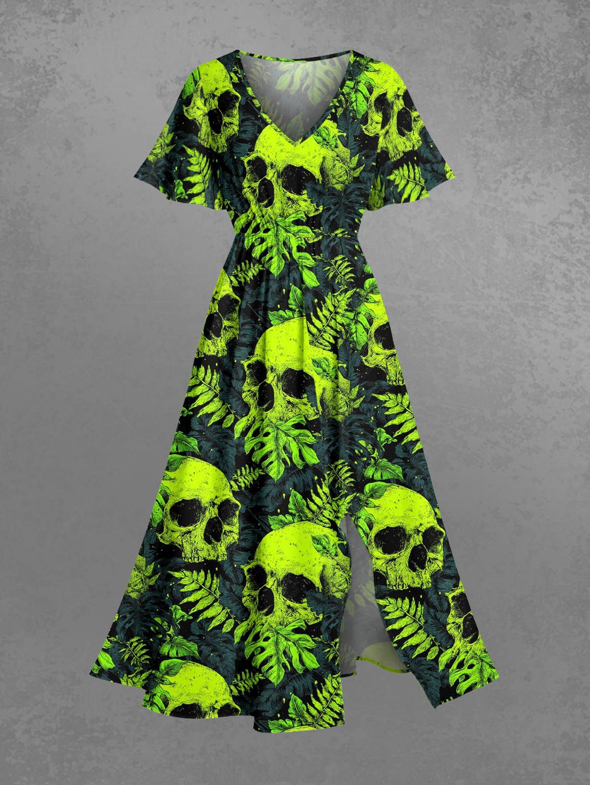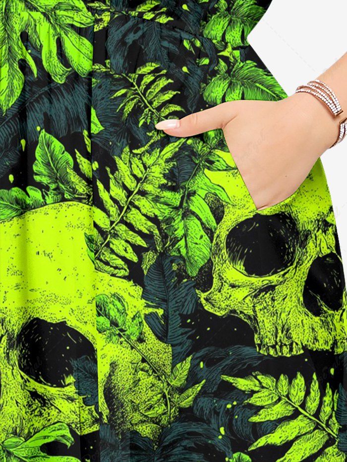 Gothic Plus Size Skull Tropical Leaf Print Split Pocket A Line Midi Dress