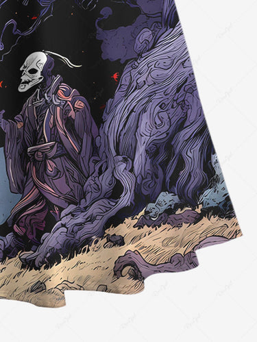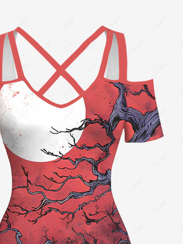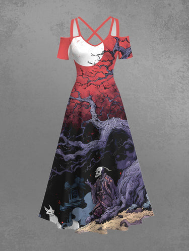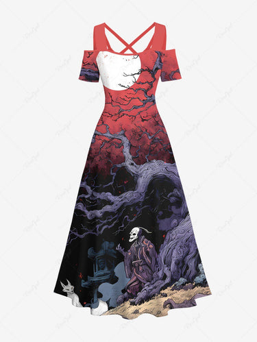 Gothic Plus Size Skull Wizard Fox Tree Ombre Galaxy Moon Print Cold Shoulder Crisscross A Line Maxi Dress