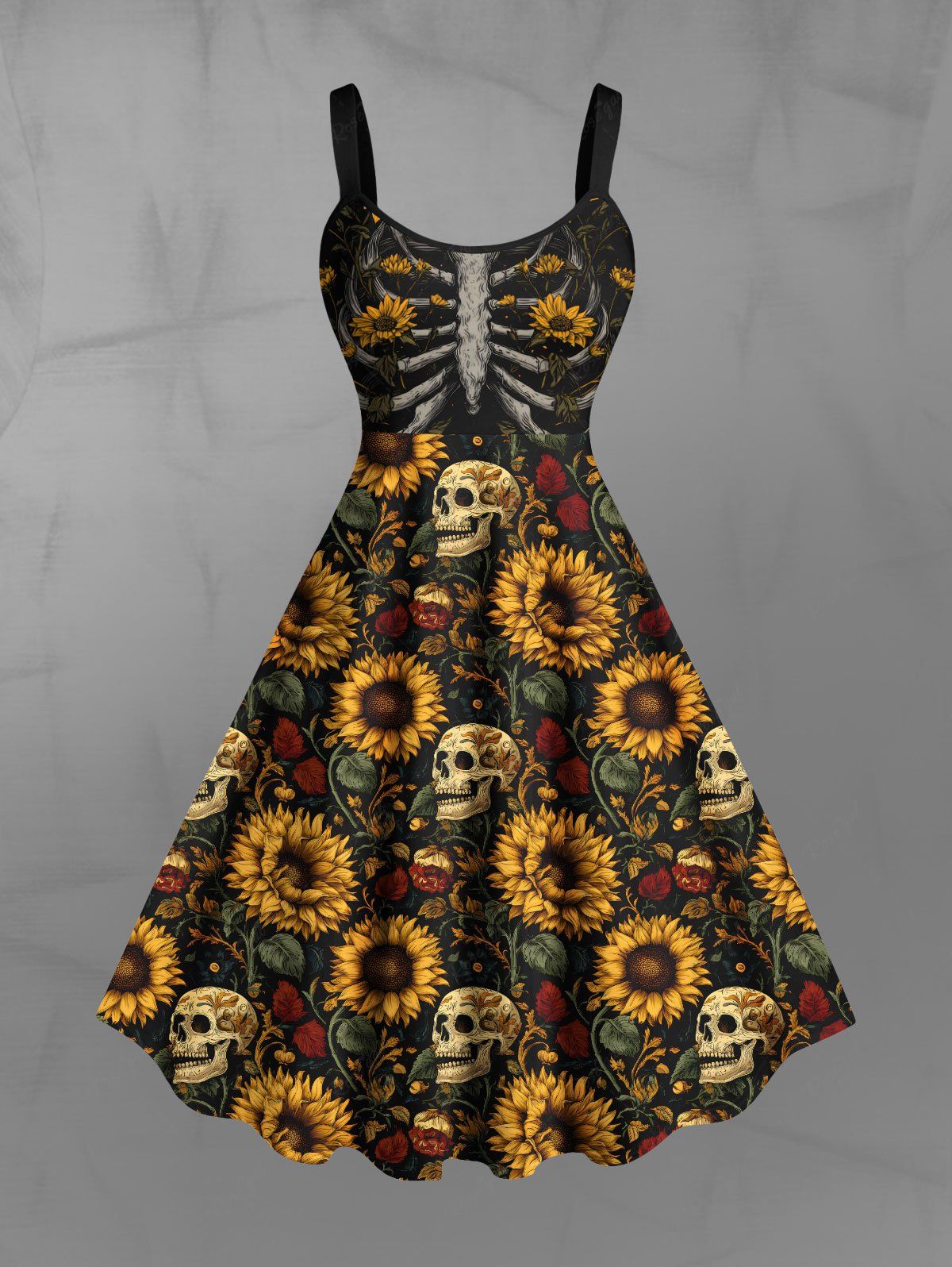 Gothic Plus Size Skulls Skeleton Sunflowers Leaf Print Tank Dress