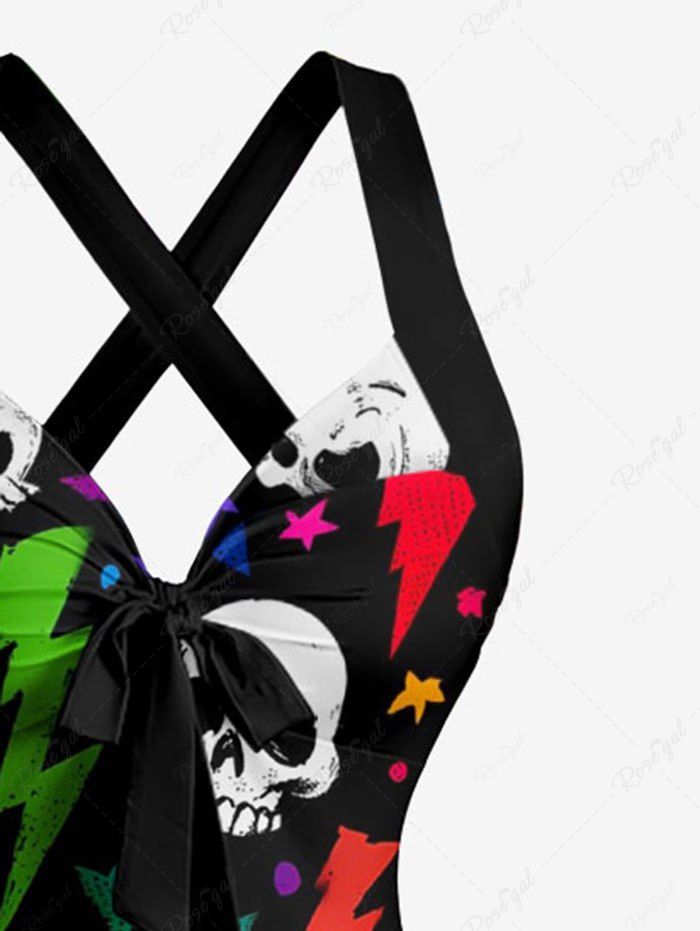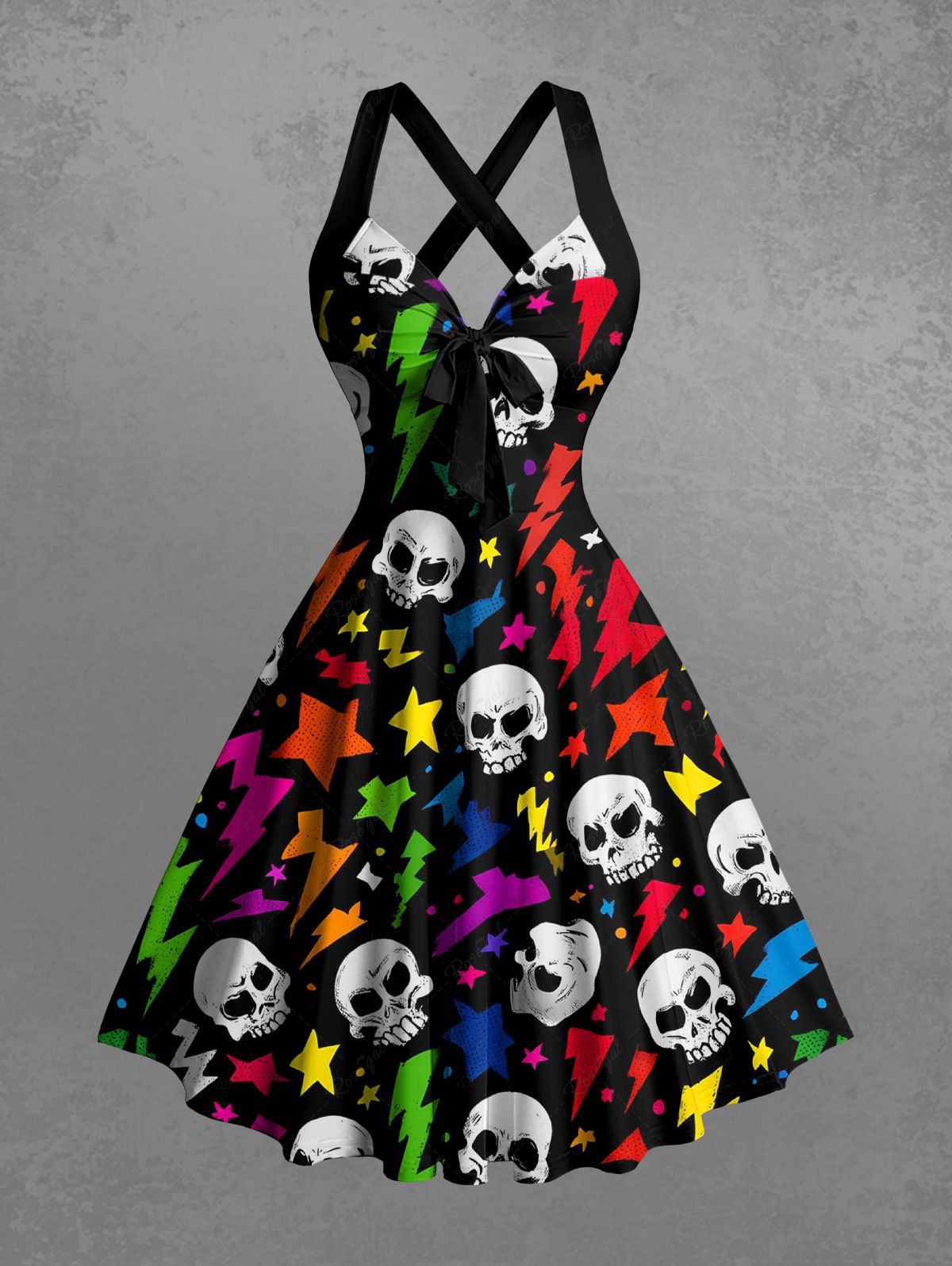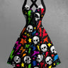 Gothic Skull Colorful Lightning Print Crisscross Strappy Halter A Line Dress