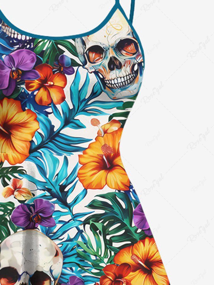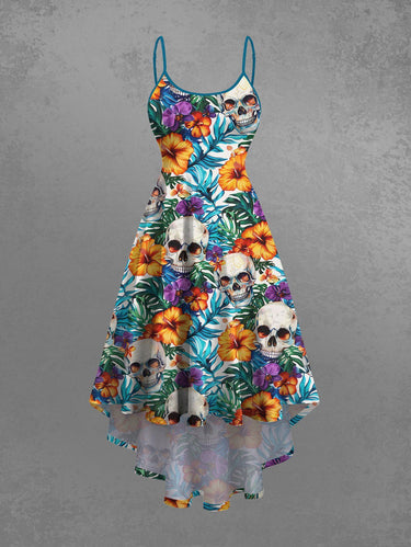 Gothic Plus Size Skull Floral Tropical Leaves Print Hawaii High Low Asymmetric Cami Dress