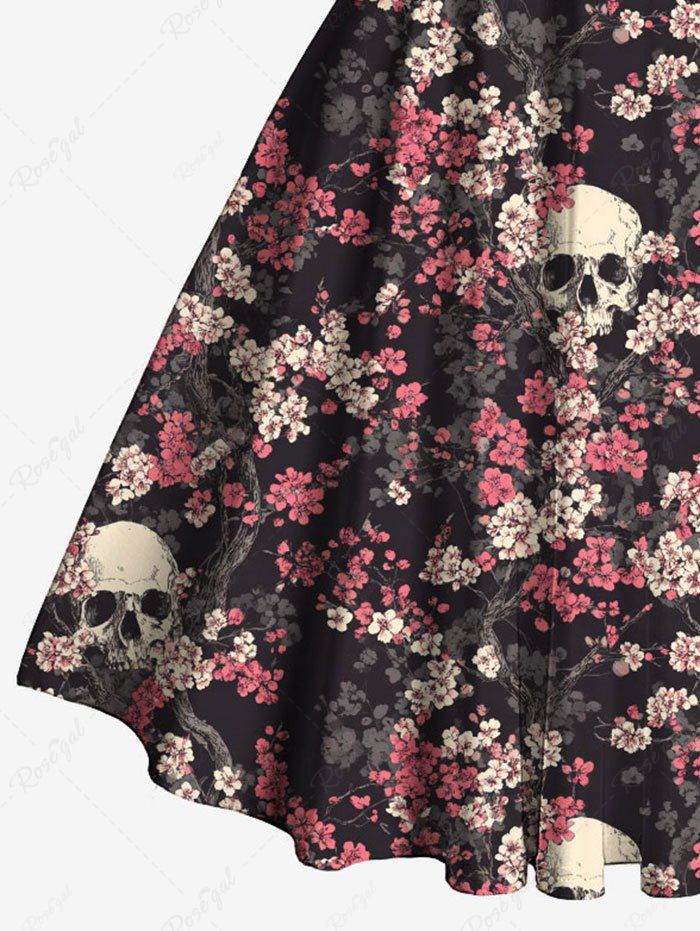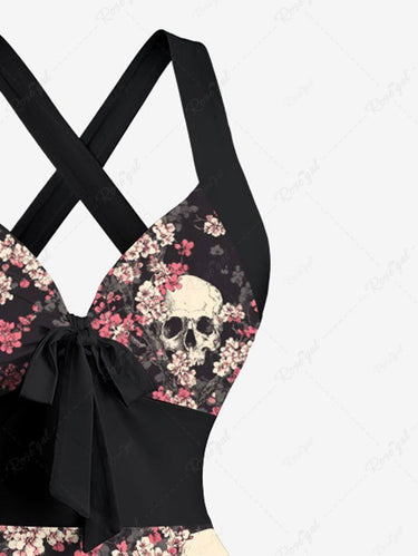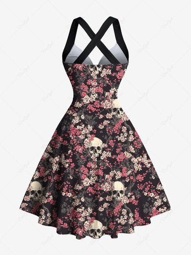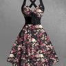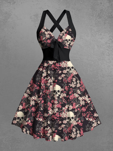 Gothic Skull Flower Print Crisscross Strappy Halter A Line Dress