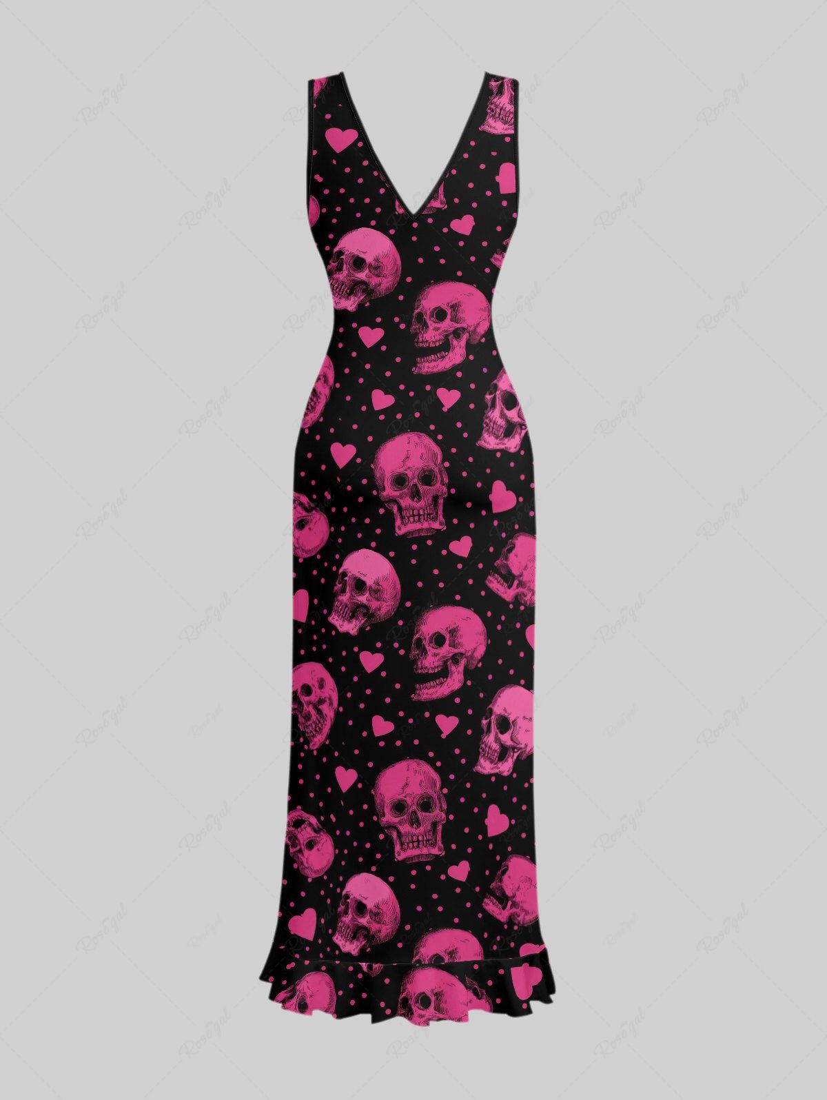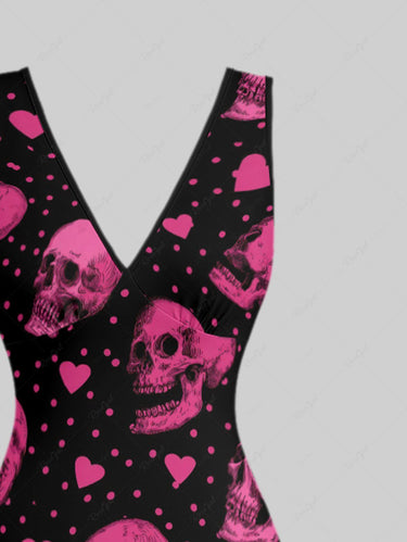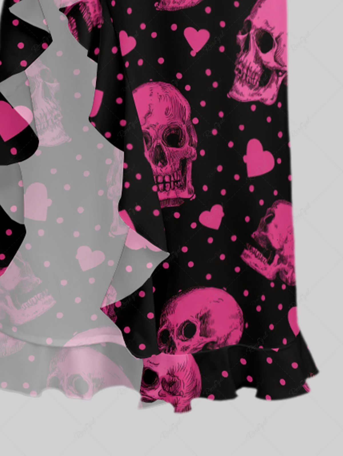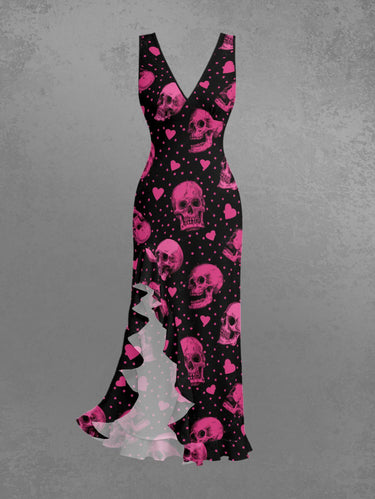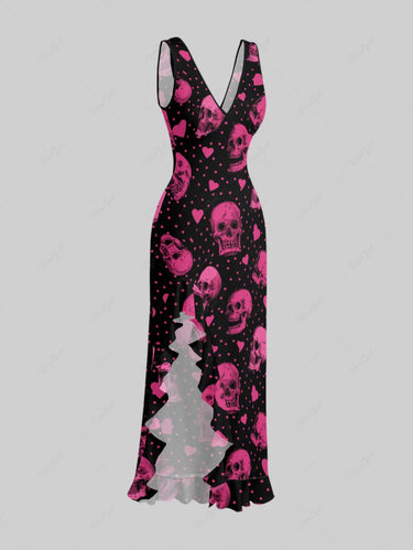 Gothic Skull Heart Pin Dot Print Valentines Ruffles Split Dress