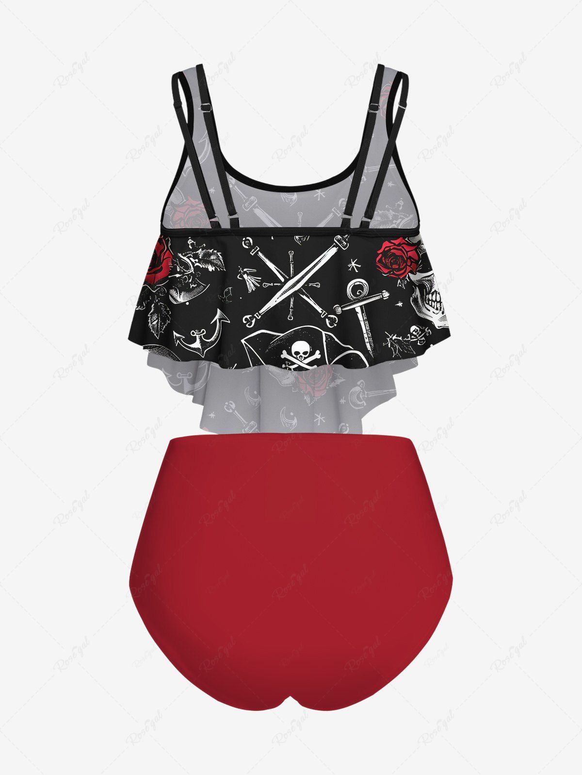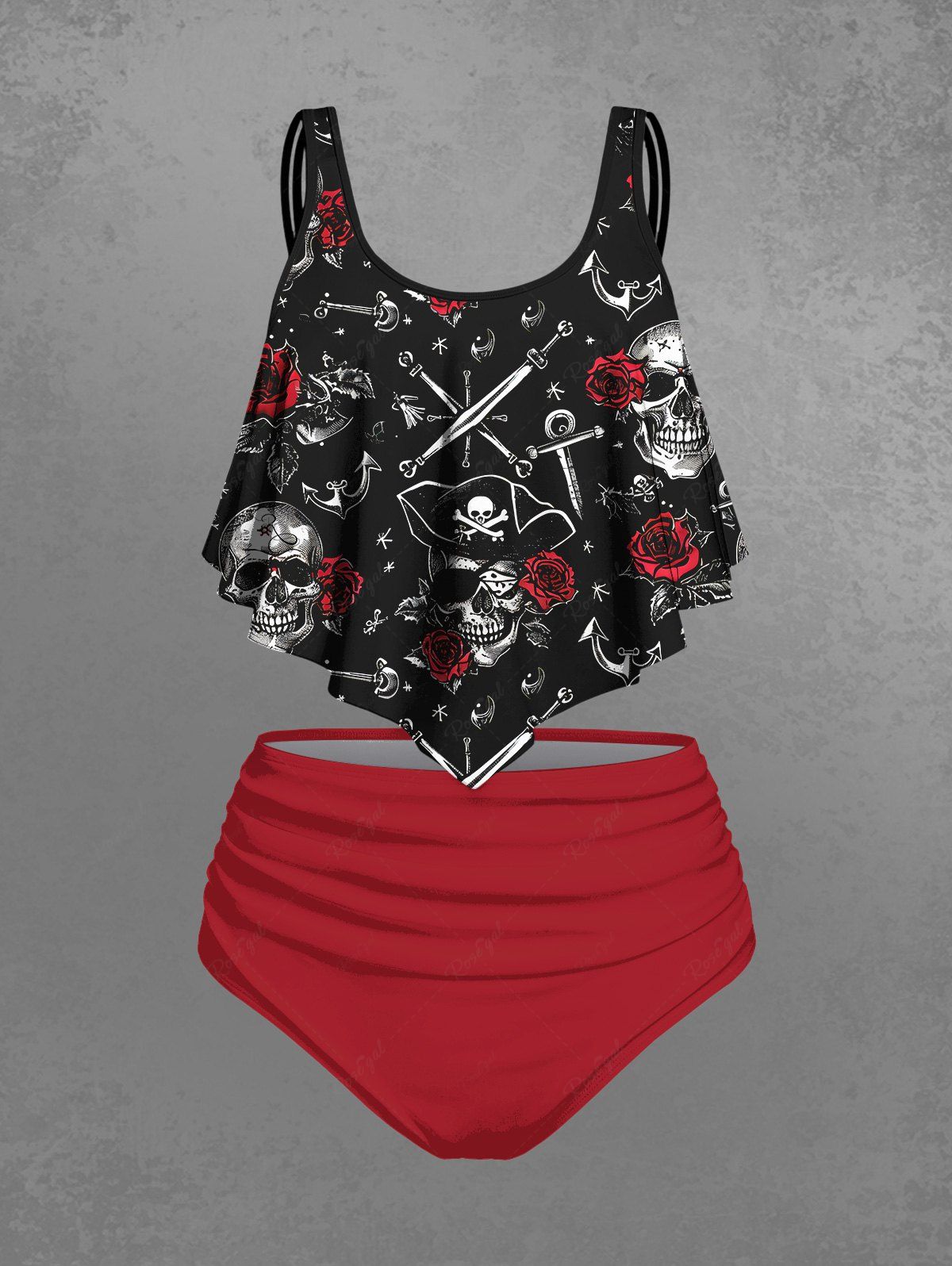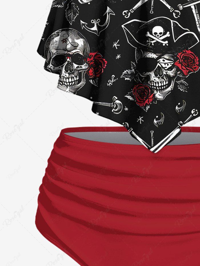 Gothic Plus Size Skull Pirate Sword Rose Flower Print Peplem Hem Tankini Swimsuit