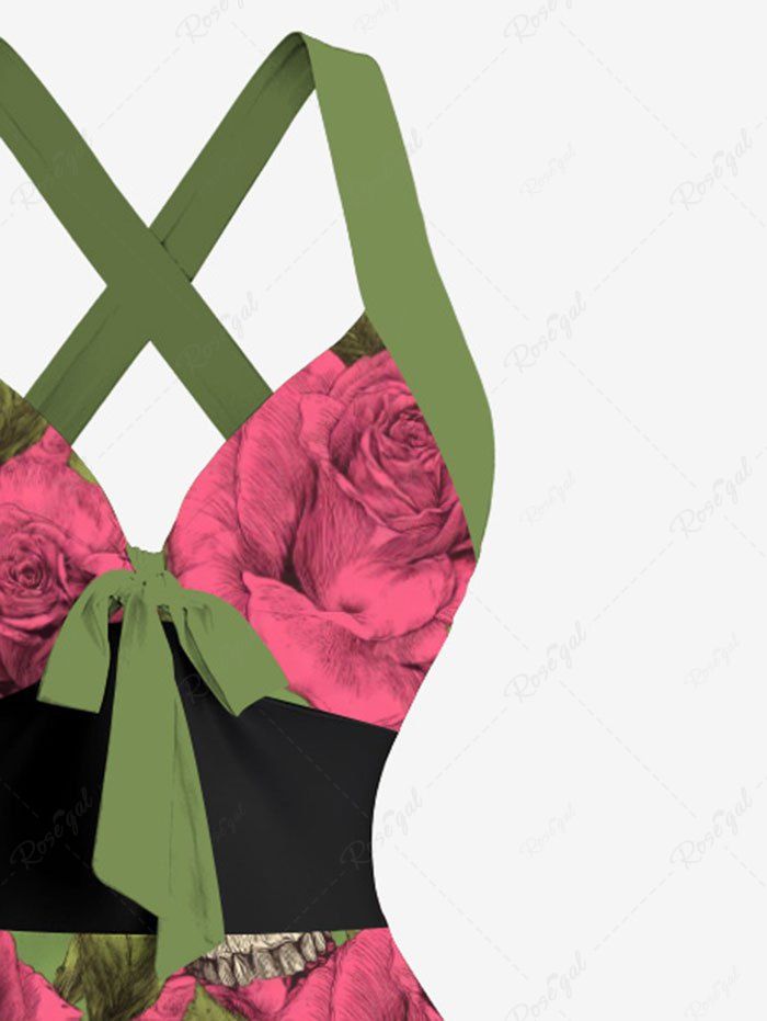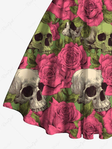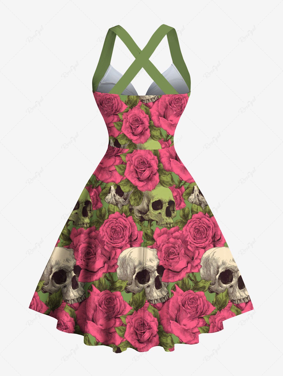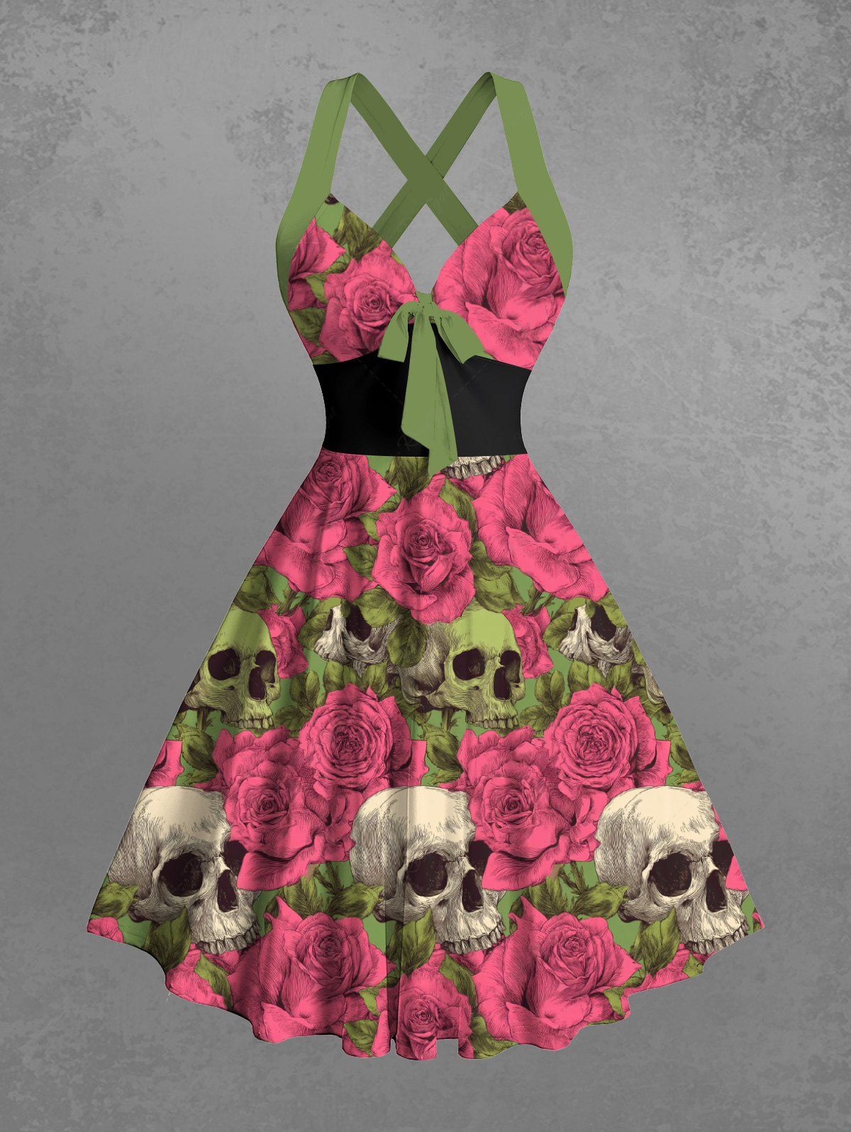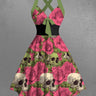 Gothic Skull Rose Flower Print Crisscross Strappy Halter A Line Dress