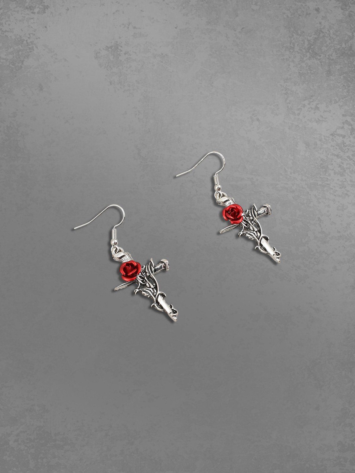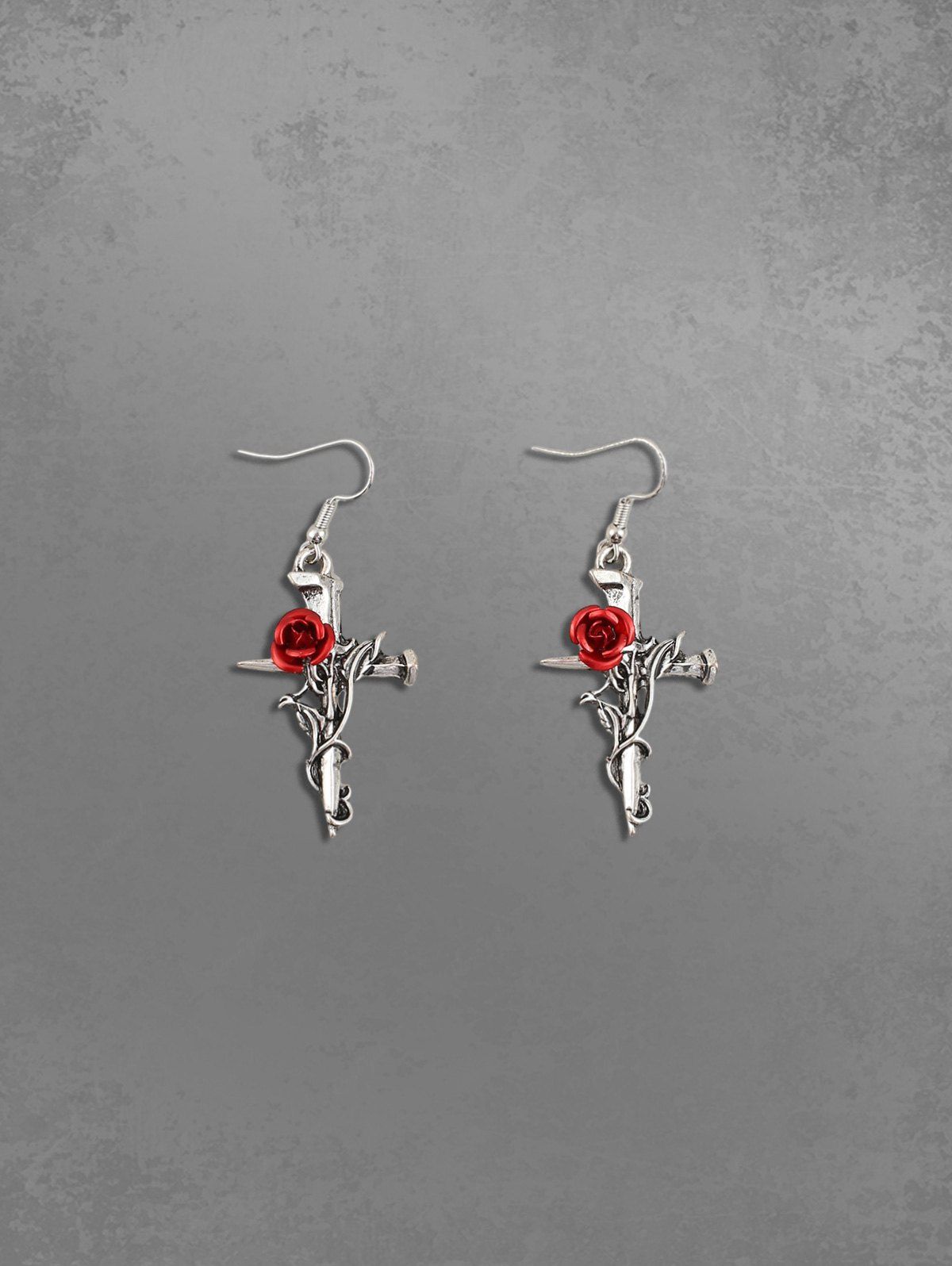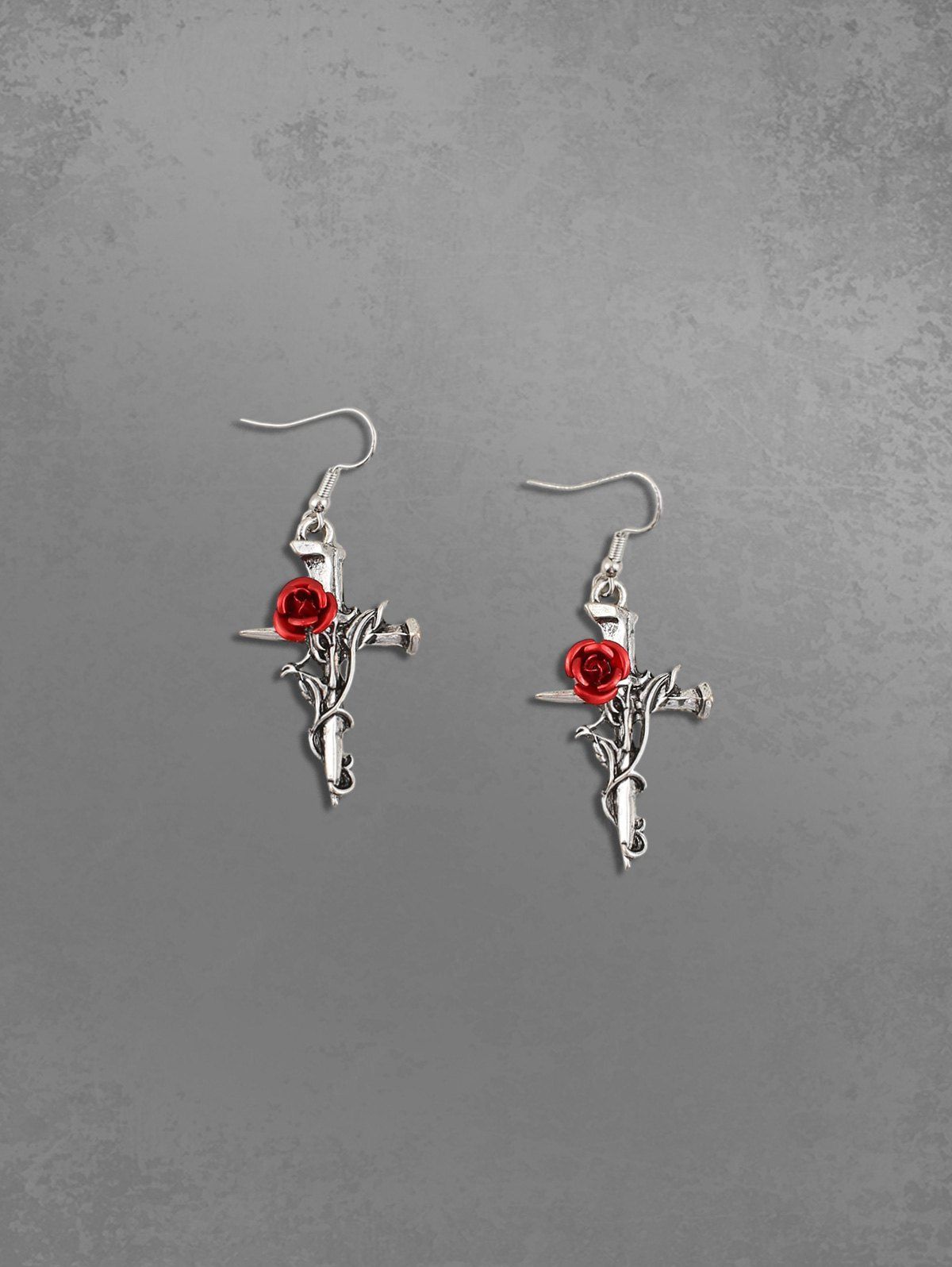 Gothic Vintage Rose Flower Leaf Cross Drop Earrings