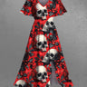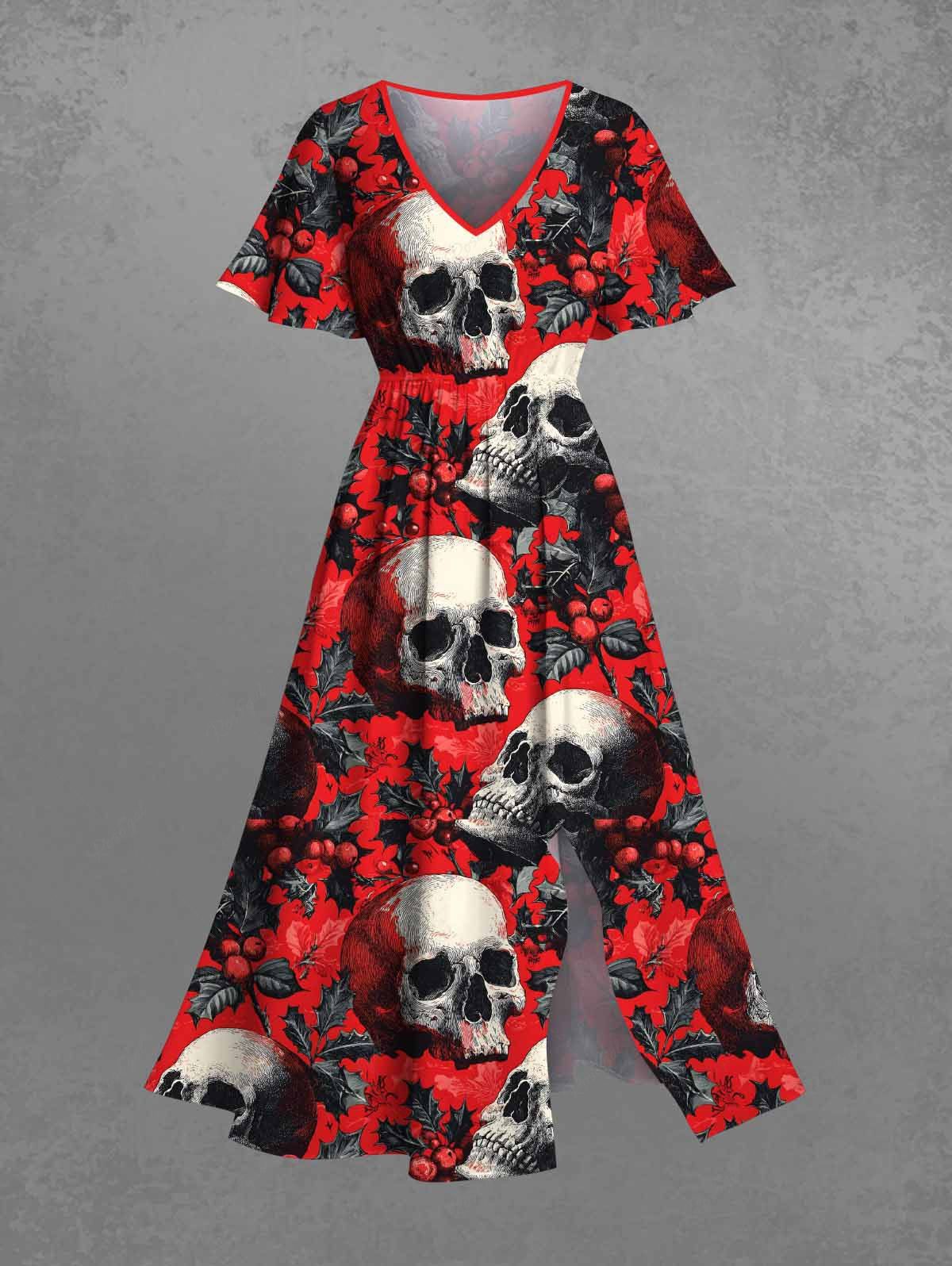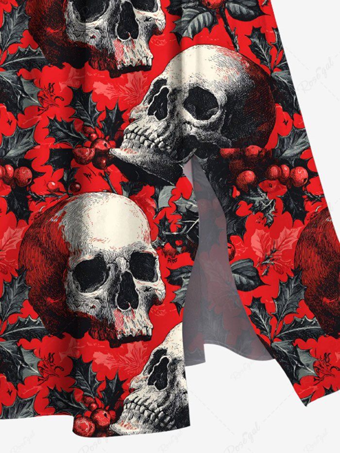Gothic Plus Size Christmas Holly Leaf Skull Print Split Pocket A Line Midi Dress