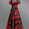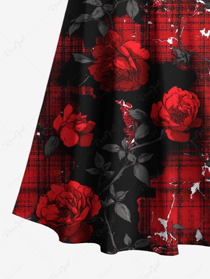 Gothic Plus Size Rose Flower Leaf Plaid Print Cold Shoulder Crisscross A Line Maxi Dress