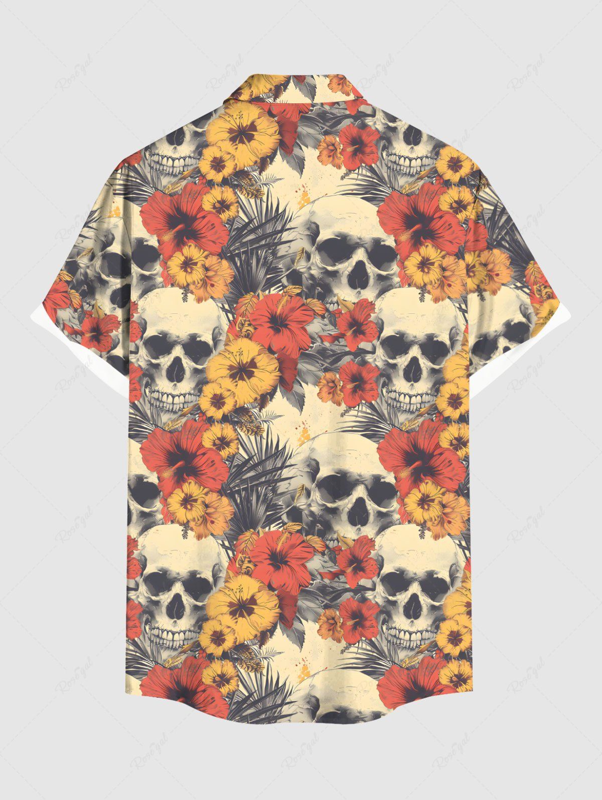 Gothic Plus Size Skull Tropical Leaf Hibiscus Flower Print Hawaii Button Pocket Shirt For Men