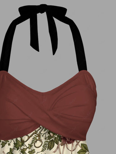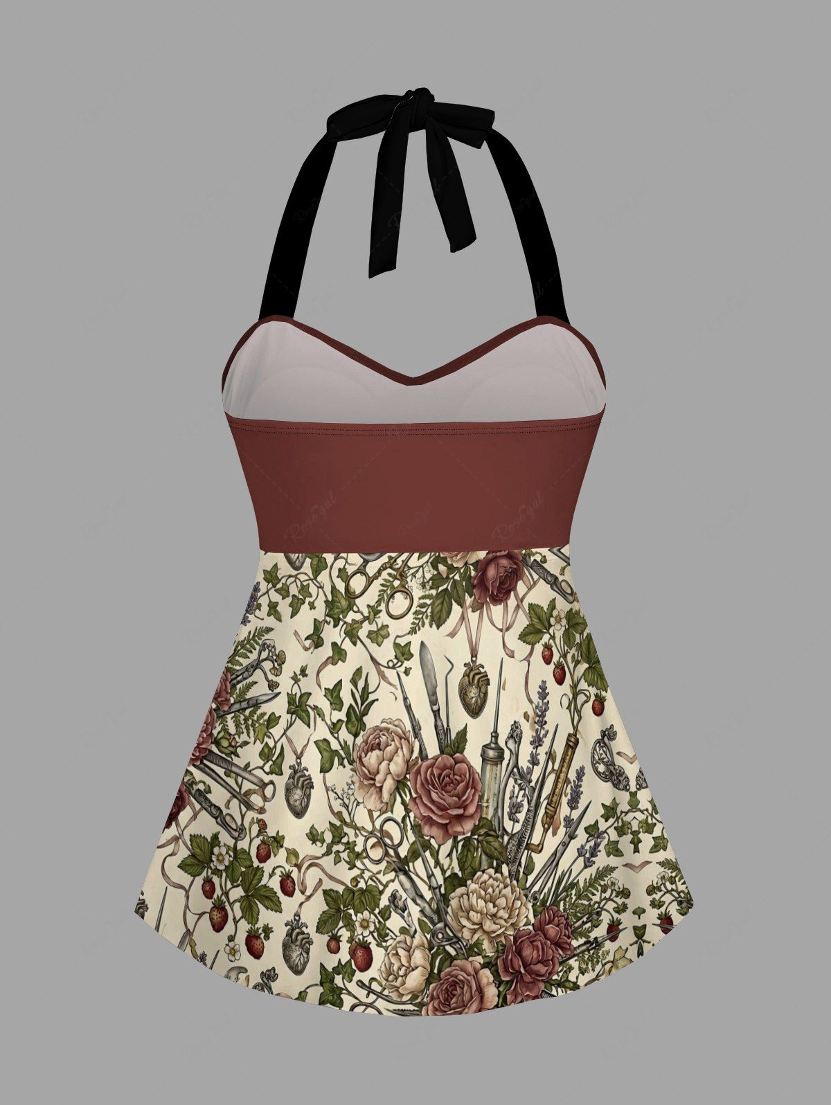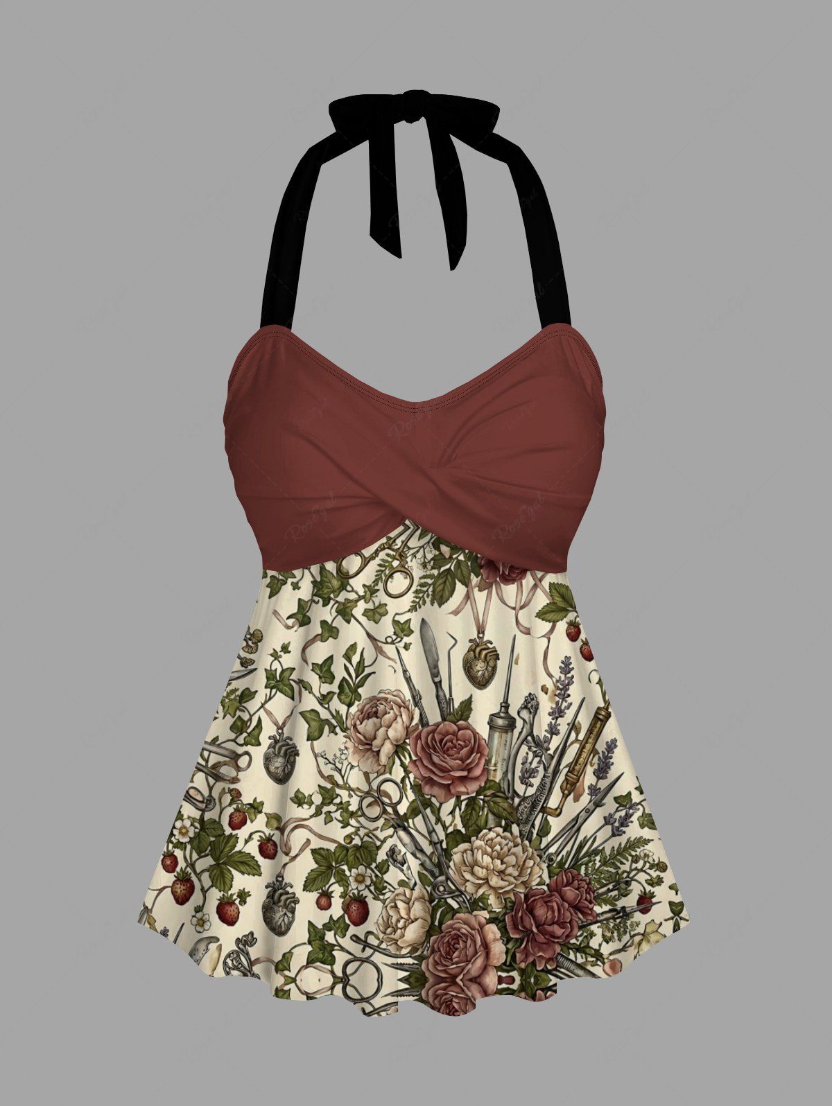 Gothic Flower Surgical Instruments Print Twist Halter Cinched Boyleg Tankini Swimsuit