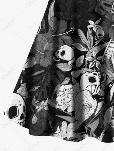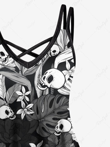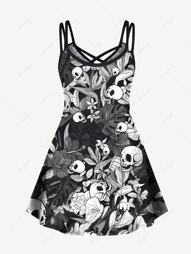 Gothic Plus Size Skull Tropical Leaves Branch Print Hawaii Crisscross A Line Cami Dress For Couples
