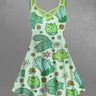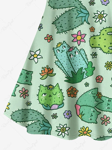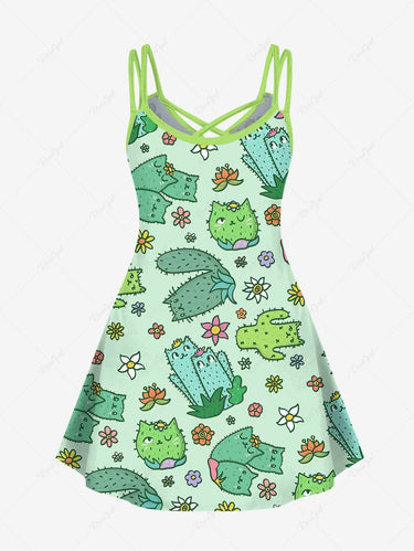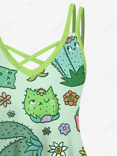 Gothic Plus Size Cartoon Cat Cactus Floral Print Crisscross A Line Cami Dress