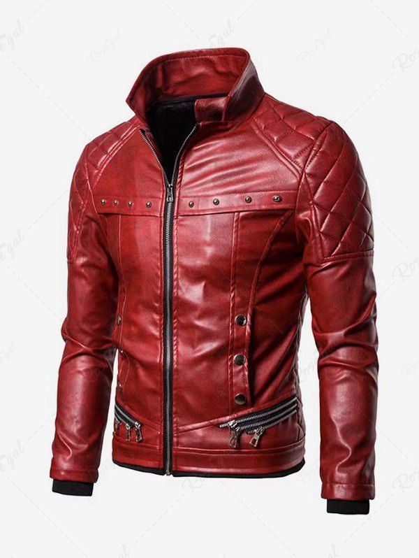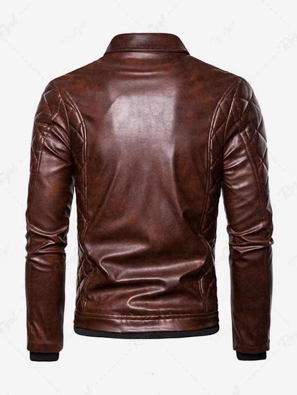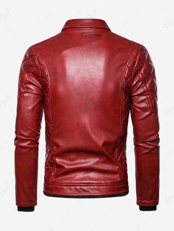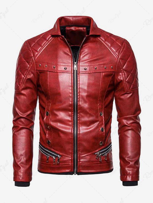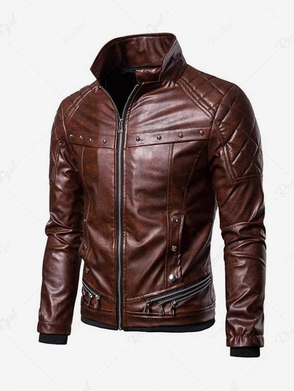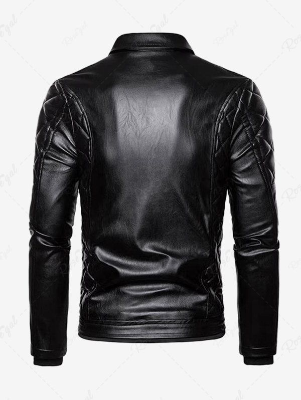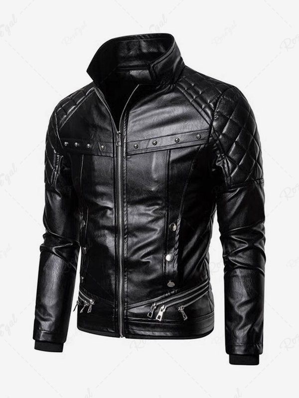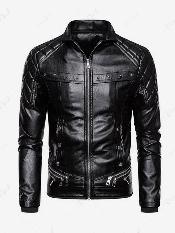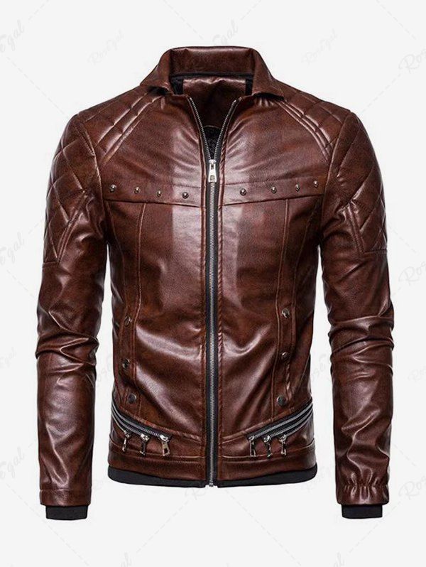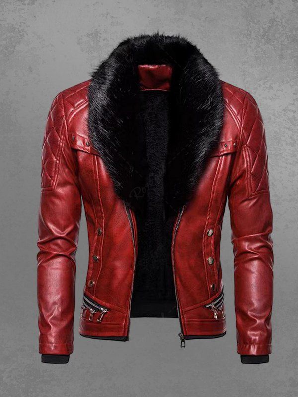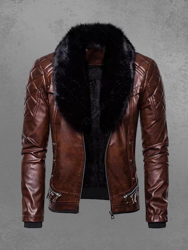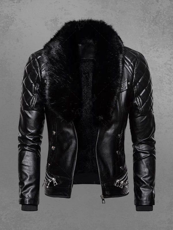 Gothic Punk PU Geometric Plaid Full Zipper Rivet Pockets Windproof Motorcycle Long Sleeves Jacket with Removable Fur Collar