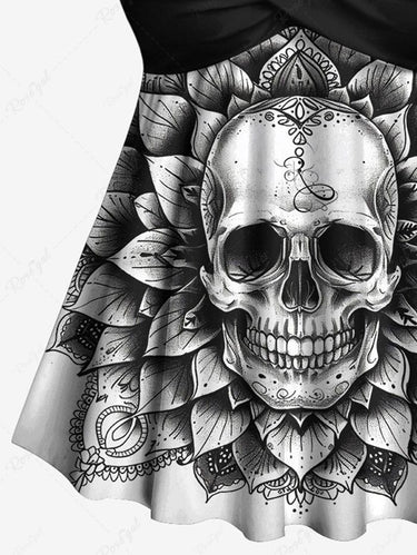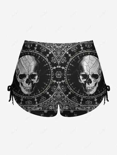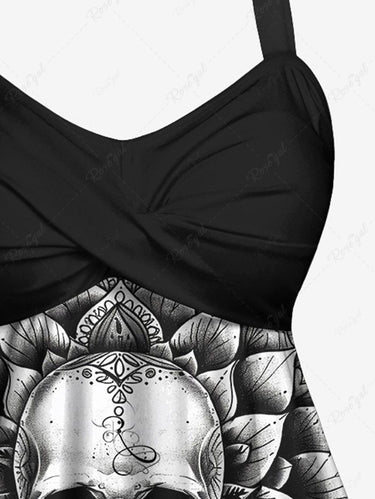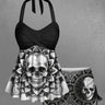 Gothic Plus Size Skull Vintage Floral Print Twist Halter Backless Cinched Boyleg Tankini Swimsuit