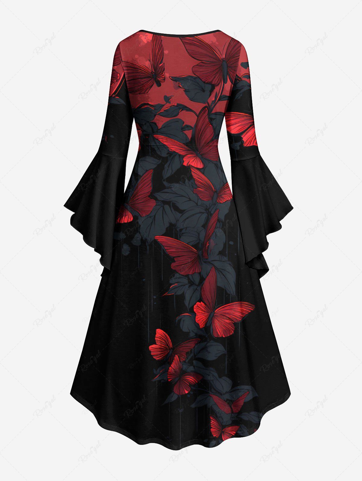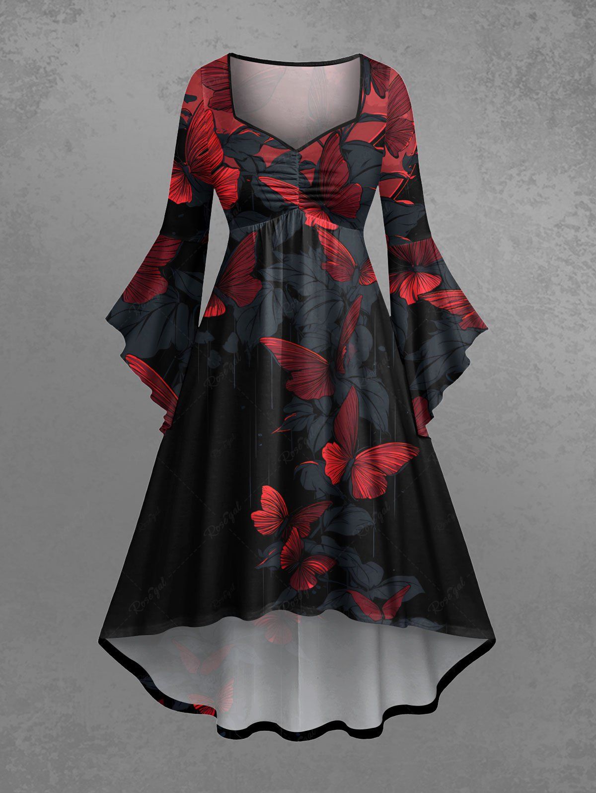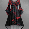 Gothic Plus Size Butterfly Leaf Print Ruched Flare Sleeves High Low Dress