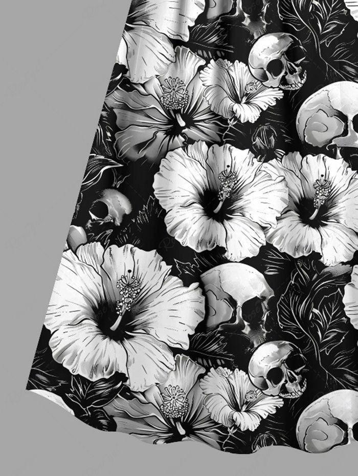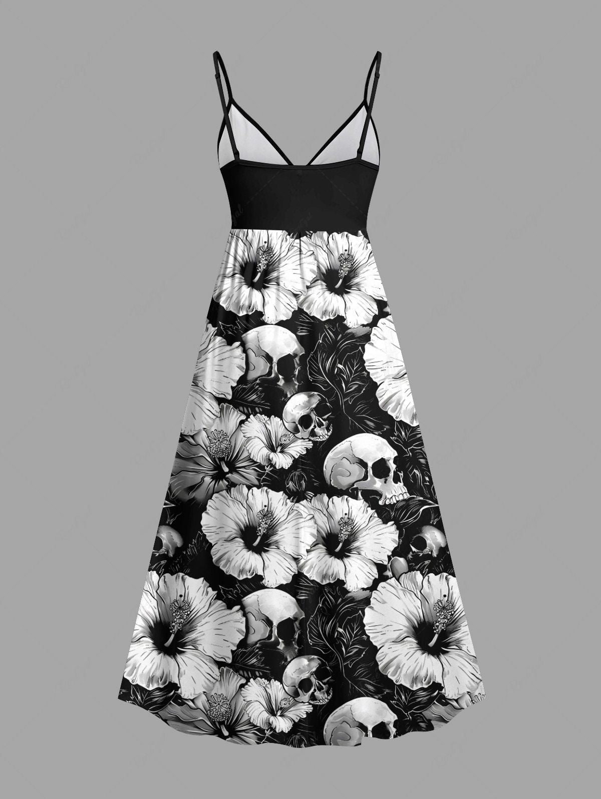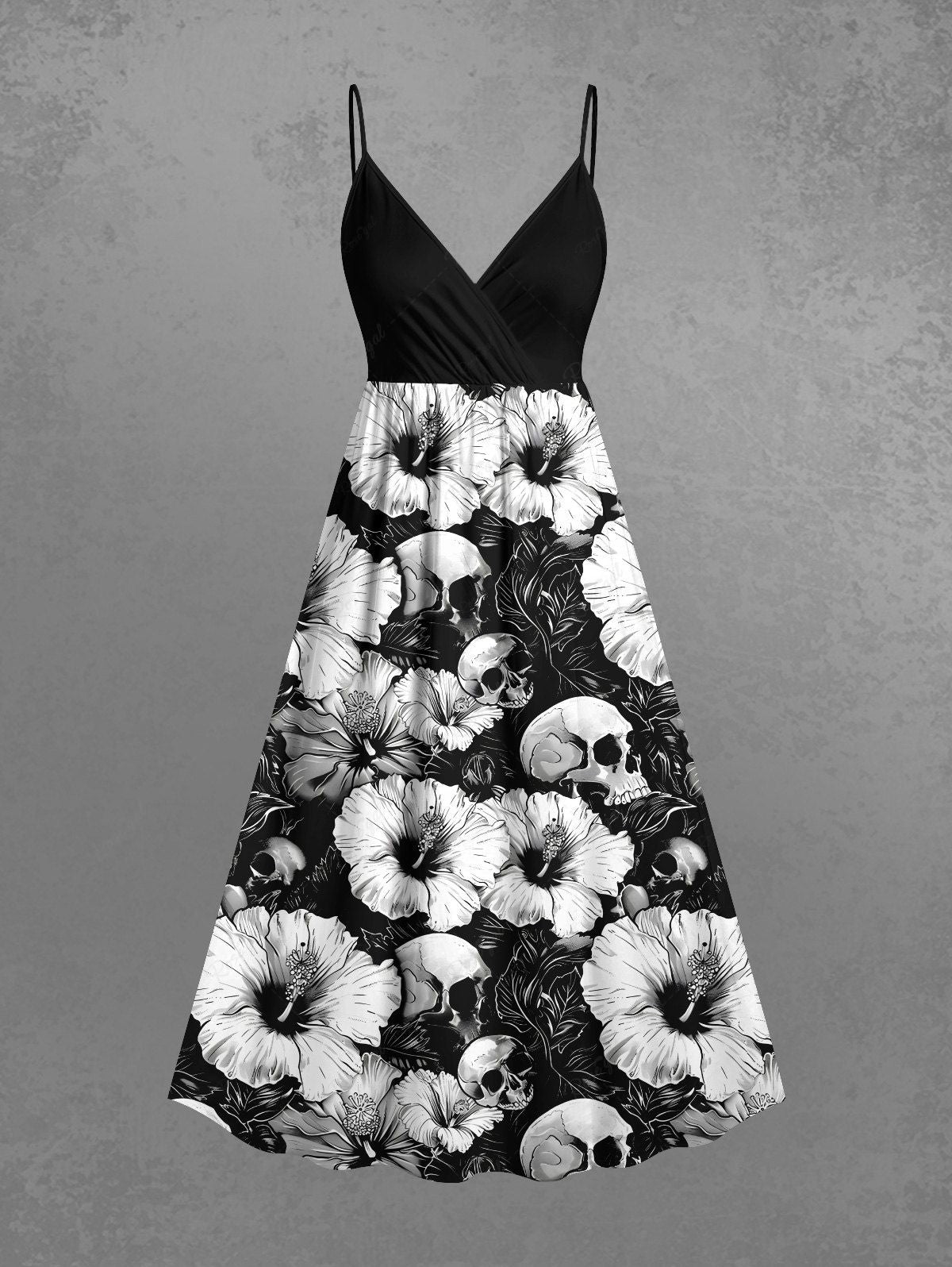 Gothic Plus Size Skull Hibiscus Flower Print Hawaii Surplice A Line Cami Dress