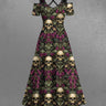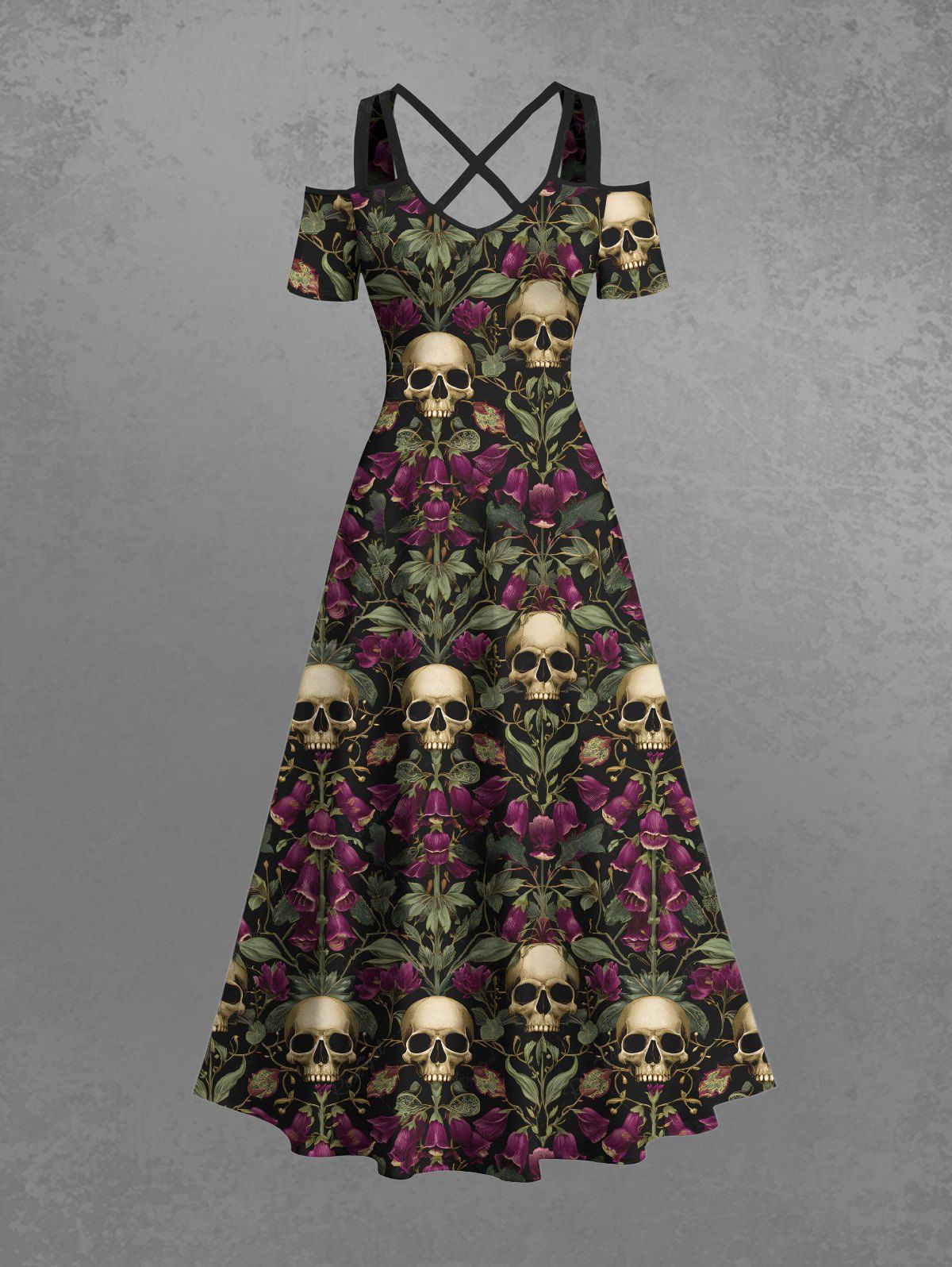 Gothic Plus Size Skull Rose Flower Print Cold Shoulder Crisscross Strappy A Line Maxi Dress