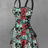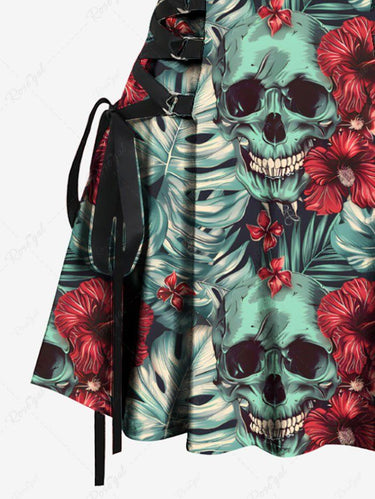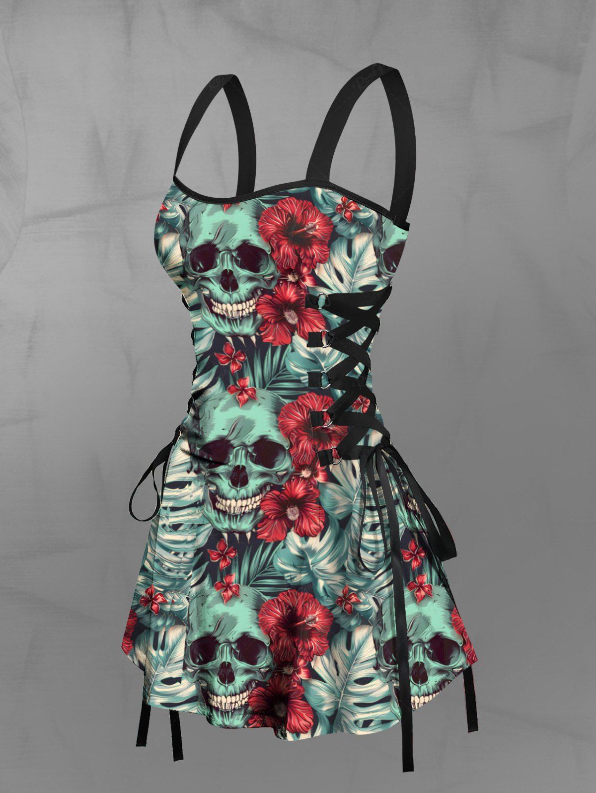 Gothic Skull Tropical Leaf Hibiscus Flower Print Hawaii Lace Up A Line Tank Dress