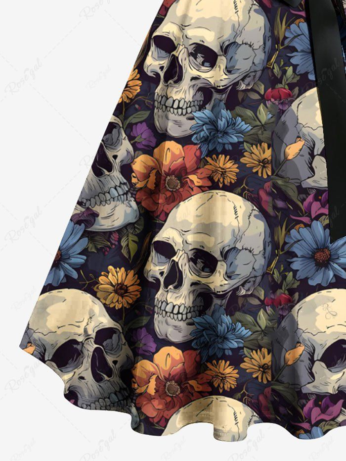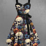 Gothic Plus Size Skull Floral Print Button A Line Tank Dress with Removable Belt