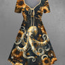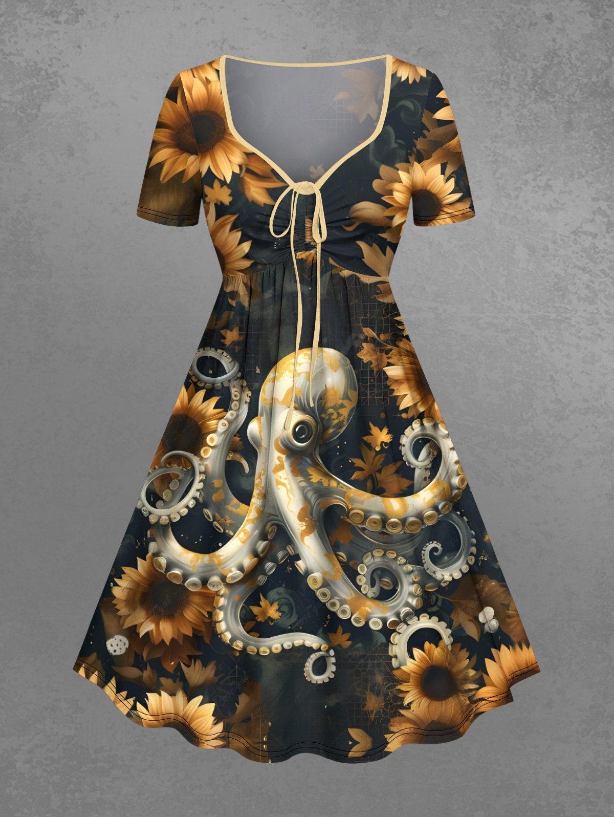 Gothic Plus Size Octopus Sunflower Print Cinched A Line Dress