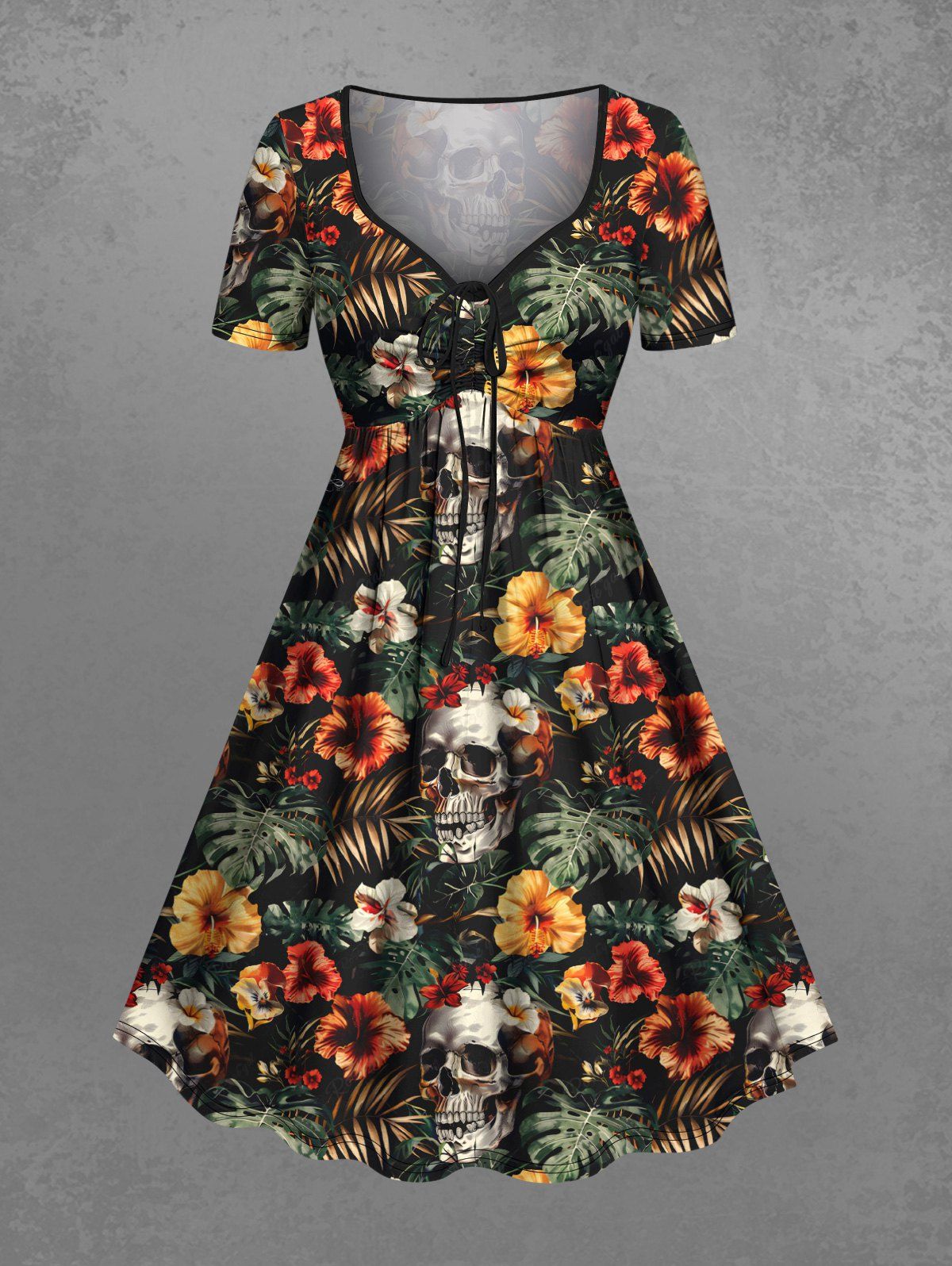 Quick viewGothic Plus Size Skull Tropical Leaf Hibiscus Flower Print Hawaii Cinched A Line Dress$53.00$43.00 /Choose options Save 15%